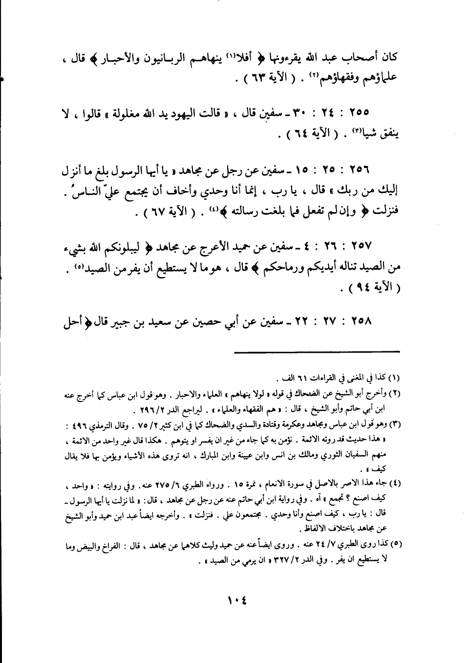 كَانَ أَصْحَابُ عَبْدِ اللَّهِ يَقْرَءُونَهَا أَفَلا يَنْهَاهُمُ الرَّبَّانِيُّونَ وَالأَحْبَارُ قَالَ علماؤهم وفقهاؤهم (الآية 63) .