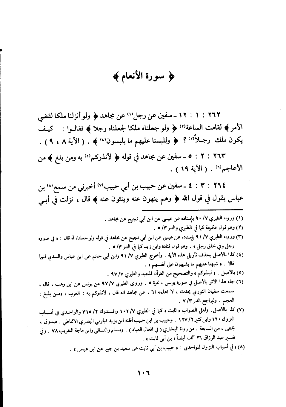 262: 1: 12 سُفْيَانُ عَنْ رَجُلٍ عَنْ مُجَاهِدٍ وَلَوْ أَنْزَلْنَا مَلَكًا لَقُضِيَ الأَمْرُ لَقَامَتِ السَّاعَةُ وَلَوْ جَعَلْنَاهُ مَلَكًا لجعلناه رجلا فَقَالُوا كَيْفَ يَكُونُ مَلَكٌ رَجُلًا وللبسنا عليهم ما يلبسون (الآية 8، 9) .