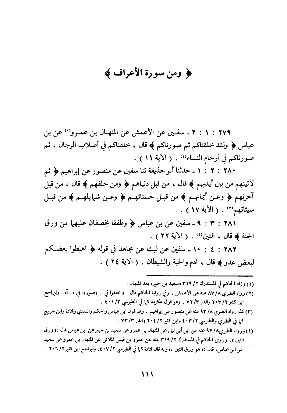 279: 1: 2 سفيان عَنِ الْأَعْمَشِ عَنِ الْمِنْهَالِ بْنِ عمرو عن بن عَبَّاسٍ وَلَقَدْ خَلَقْنَاكُمْ ثُمَّ صَوَّرْنَاكُمْ قَالَ خَلَقْنَاكُمْ فِي أَصْلابِ الرِّجَالِ ثُمَّ صَوَّرْنَاكُمْ فِي أَرْحَامِ النِّسَاءِ (الآية 11) .