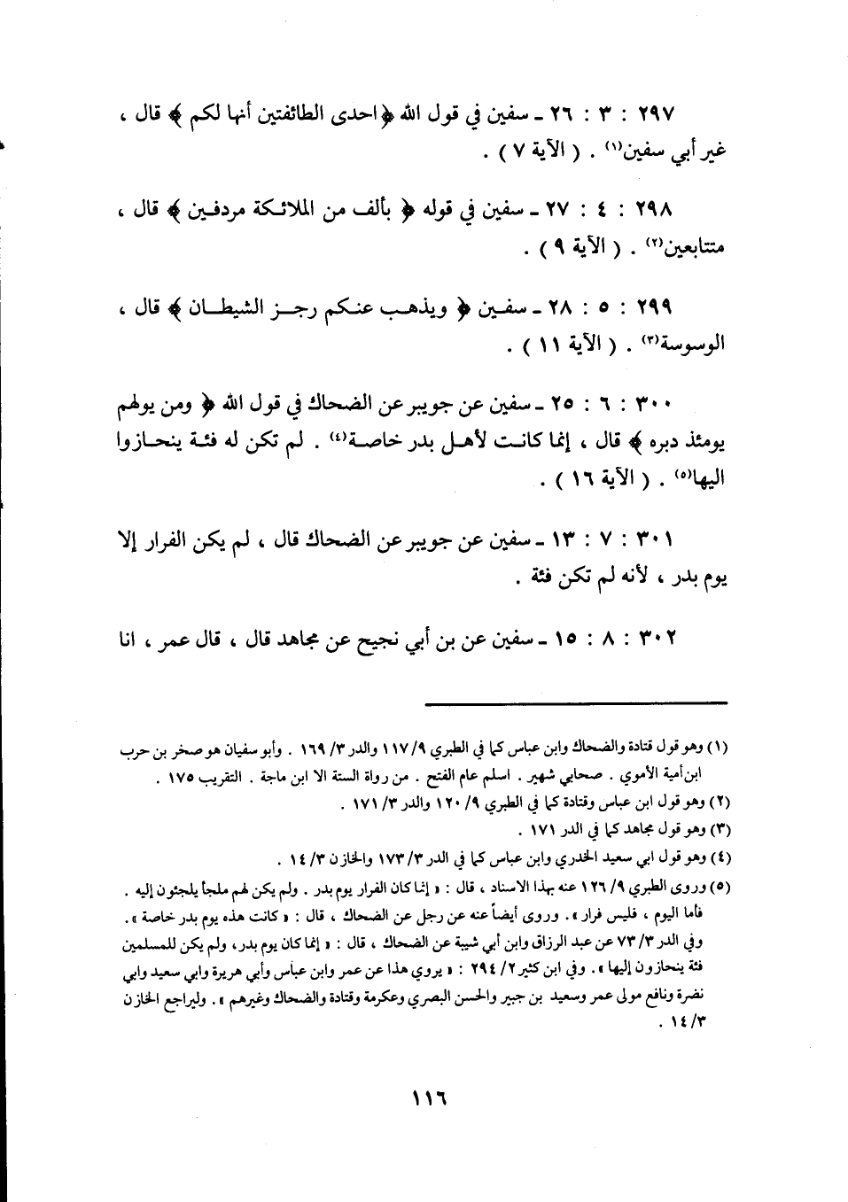 298: 4: 27 سُفْيَانَ فِي قَوْلِهِ بِأَلْفٍ مِنَ الملائكة مردفين قال متتابعين (الآية 9) .