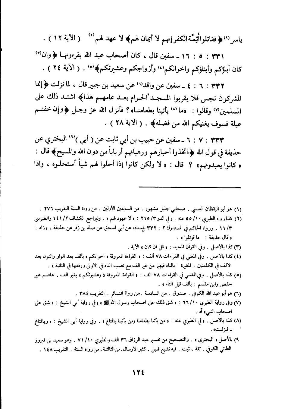 331: 5: 16 سفيان قَالَ كَانَ أَصْحَابُ عَبْدِ اللَّهِ يَقْرَءُونَهَا وإِنْ كَانَ آبَاؤُكُمْ وَأَبْنَاؤُكُمْ وأخوانكم وأزواجكم وعشيرتكم (الآية 24) .
