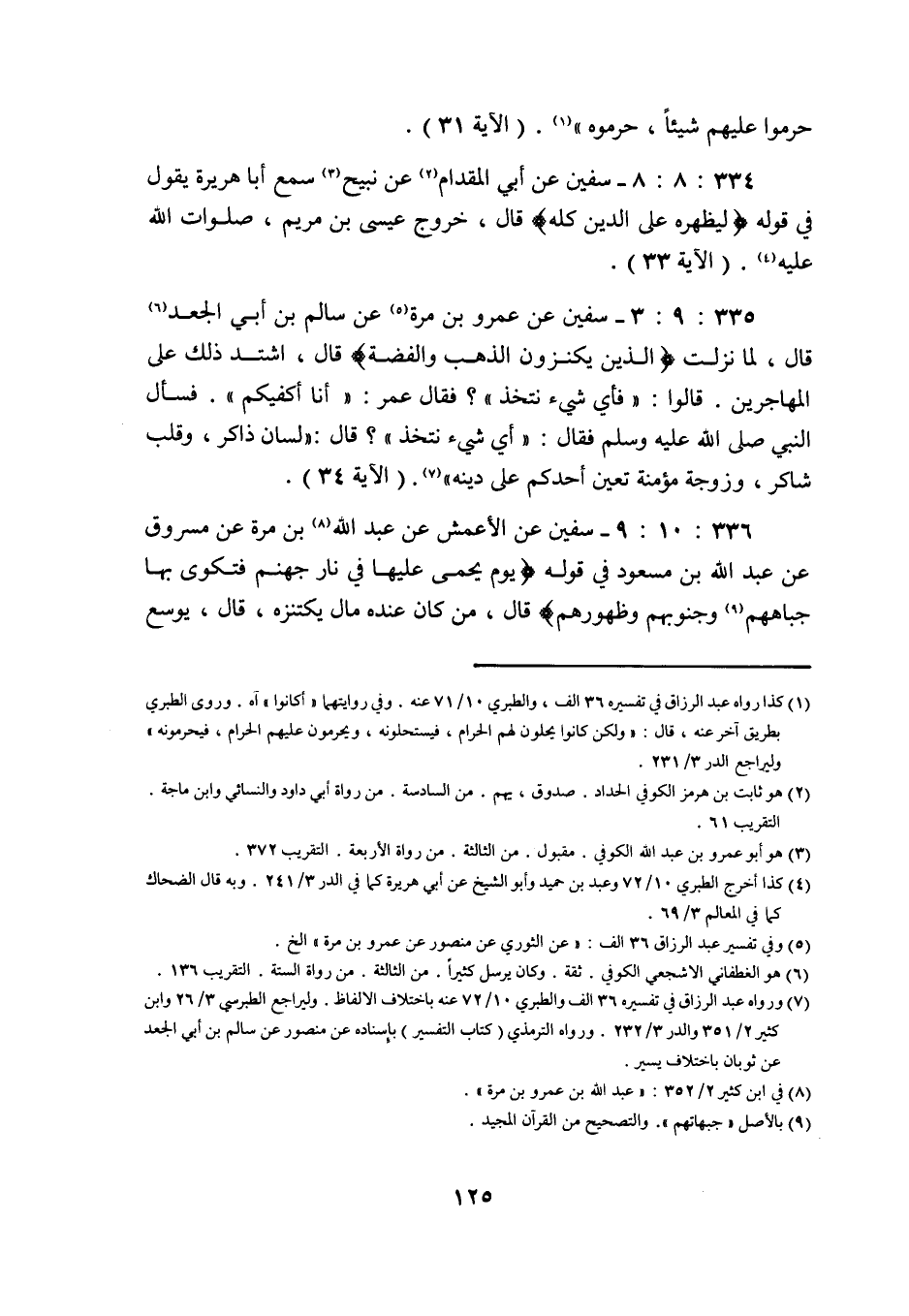 334: 8: 8 سفيان عَنْ أَبِي الْمِقْدَامِ عَنْ نُبَيْحٍ سَمِعَ أَبَا هُرَيْرَةَ يَقُولُ فِي قوله وكان على الدين كله قَالَ خُرُوجُ عِيسَى بِنْ مَرْيَمَ صلوات الله عليه (الآية 33) .