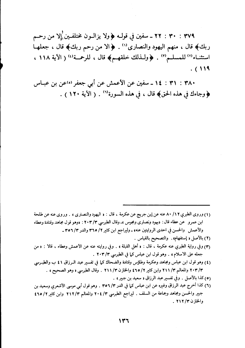379: 30: 22 سفيان فِي قَوْلِهِ وَلا يَزَالُونَ مُخْتَلِفِينَ إلا من رحم ربك قَالَ مِنْهُمُ الْيَهُودُ وَالنَّصَارَى إِلا من رحم ربك قال جعلها استثناء للمسلم خلقهم قال للرحمة (الآية 118، 380: 31: 14 سفيان عَنِ الْأَعْمَشِ عَنْ أَبِي جَعْفَرٍ عن بن عَبَّاسٍ وَجَاءَكَ فِي هَذِهِ الْحَقُّ قال في هذه السورة (الآية 120) .
