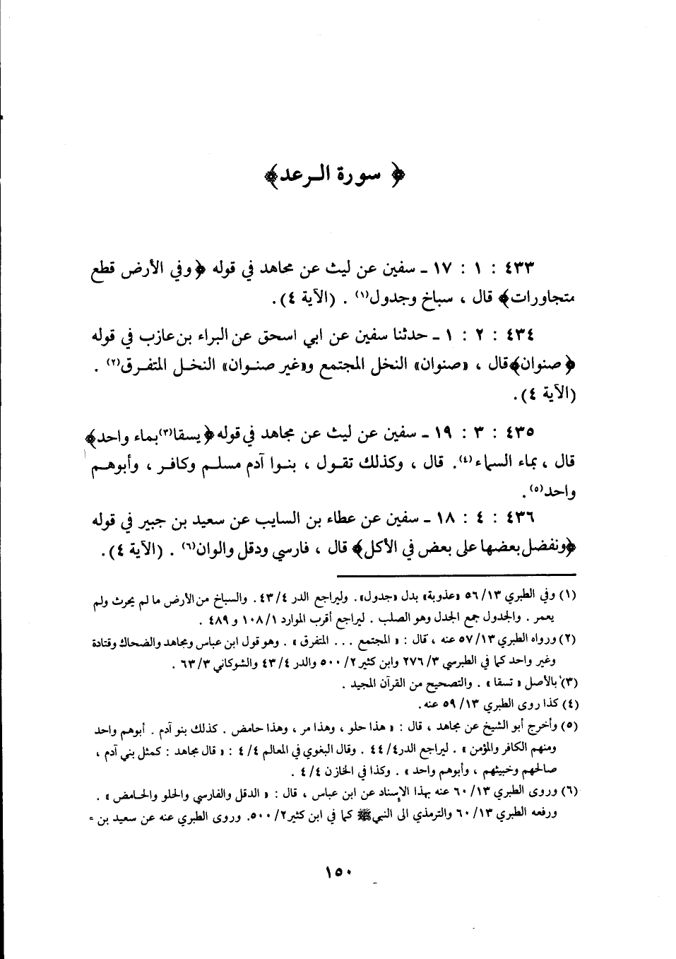 433: 1: 17 سُفْيَانُ عَنْ لَيْثٍ عَنْ مُجَاهِدٍ في قوله الأرض قطع متجاورات قال سباخ وجدول (الآية 4) .