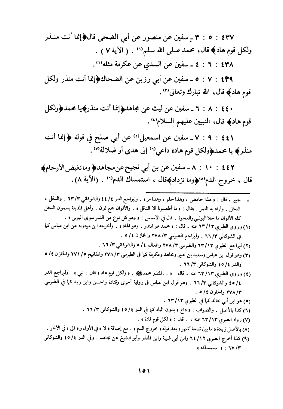 437: 5: 3 سفيان عَنْ مَنْصُورٍ عَنْ أَبِي الضُّحَى قال أَنْتَ مُنْذِرٌ وَلِكُلِّ قَوْمٍ هَادٍ قَالَ مُحَمَّدٌ صَلَّى اللَّهُ عَلَيْهِ وسلم (الآية 7) .