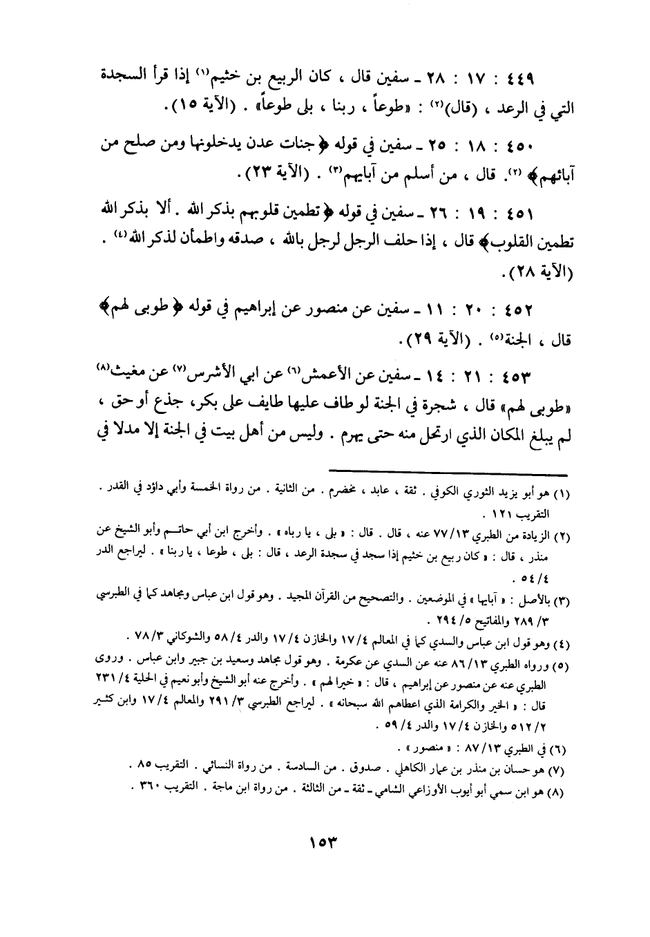 449: 17: 28 سفيان قال كَانَ الرَّبِيعُ بْنُ خُثَيْمٍ إِذَا قَرَأَ السَّجْدَةَ الَّتِي فِي الرَّعْدِ قَالَ طَوْعًا رَبَّنَا بَلَى طَوْعًا (الآية 15) .