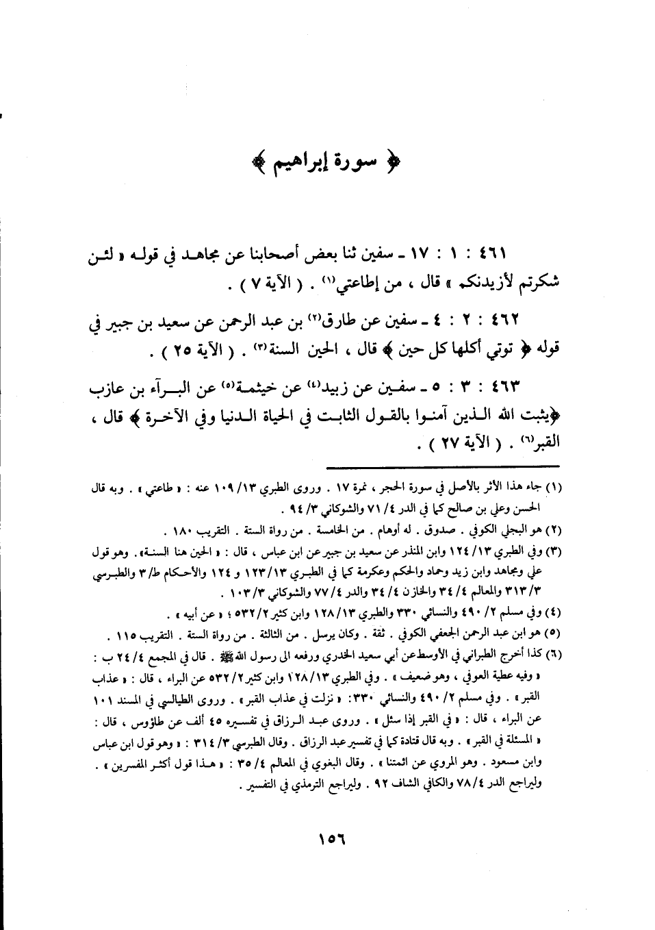463: 3: 5 سفيان عَنْ زُبَيْدٍ عَنْ خَيْثَمَةَ عَنِ البراء بن عازب اللَّهُ الَّذِينَ آمَنُوا بِالْقَوْلِ الثَّابِتِ فِي الْحَيَاةِ الدُّنْيَا وَفِي الآخِرَةِ قال القبر (الآية 27) .