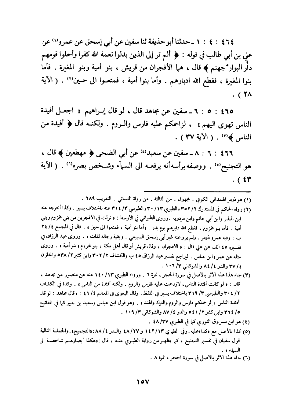 464: 4: 1 حَدَّثَنَا أَبُو حُذَيْفَةَ ثَنَا سُفْيَانُ عن أبي إسحق عَنْ عَمْرٍو عَنْ عَلِيِّ بْنِ أبي طالب في قوله تر إلى الذين بدلوا نعمة اللَّهِ كُفْرًا وَأَحَلُّوا قَوْمَهُمْ دَارَ البوار جهنم قَالَ هُمَا الأَفْجَرَانِ مِنْ قُرَيْشٍ بَنُو أُمَيَّةَ وَبَنُو الْمُغِيرَةِ فَأَمَّا