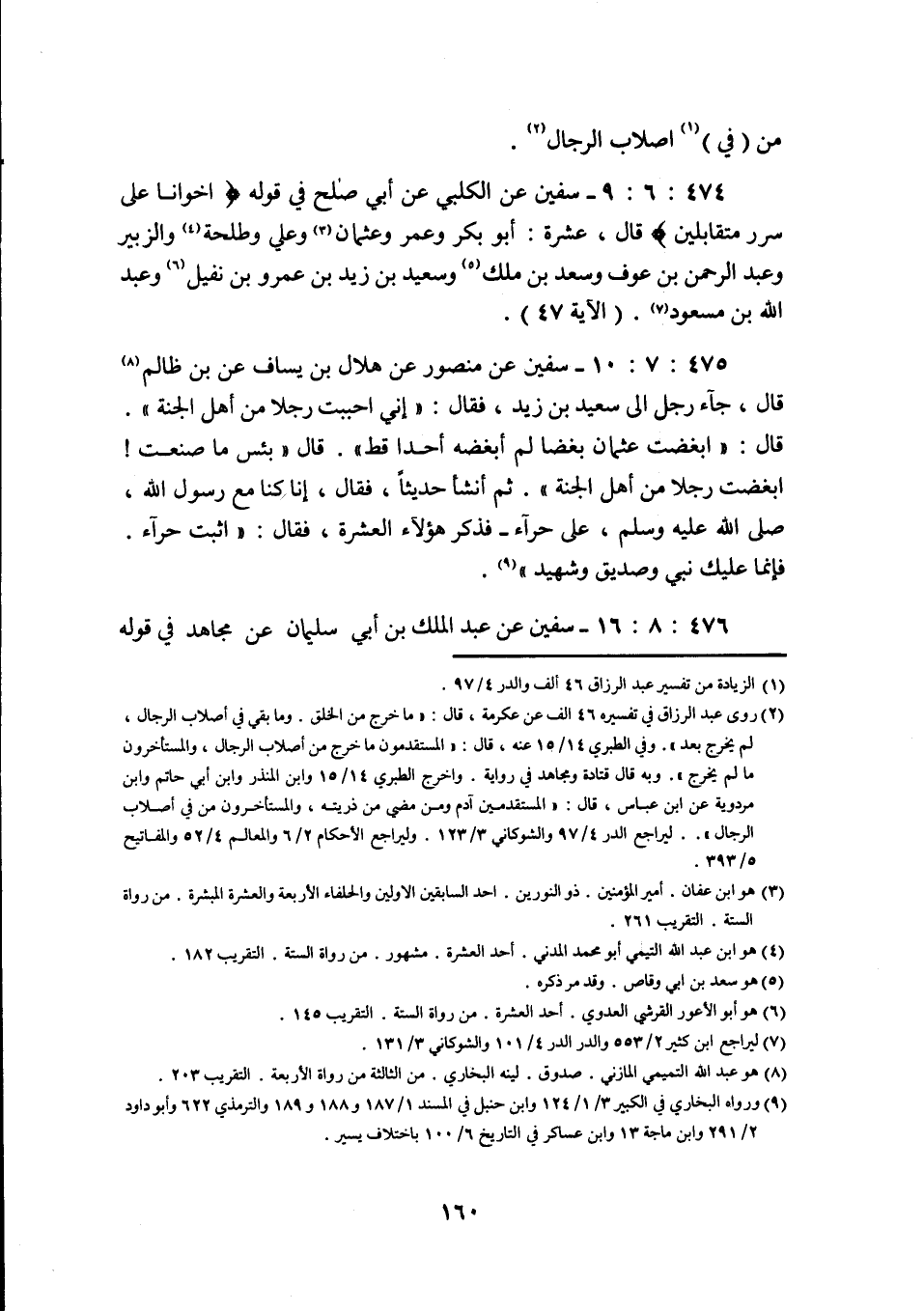474: 6: 9 سفيان عن الكلبي عن أبي صلح في قوله إخوانا على يقول علي سرر متقابلين قَالَ عَشْرَةٌ أَبُو بَكْرٍ وَعُمَرُ وَعُثْمَانُ وَعَلِيٌّ وَطَلْحَةُ وَالزُّبَيْرُ وَعَبْدُ الرَّحْمَنِ بْنُ عَوْفٍ وَسَعْدُ بْنُ ملك وَسَعِيدُ بْنُ زَيْدِ بْنِ عَمْرِو بْنِ نُفَيْلٍ وَعَبْدُ اللَّهِ بْنُ مسعود (الآية 47) .