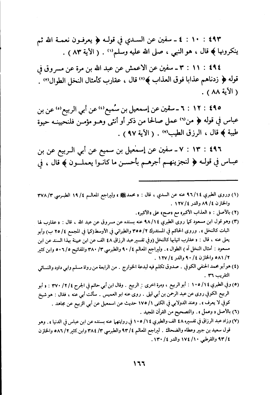 494: 11: 3 سفيان عَنِ الْأَعْمَشِ عَنْ عَبْدِ اللَّهِ بْنِ مُرَّةَ عَنْ مَسْرُوقٍ فِي قَوْلِهِ زِدْنَاهُمْ عَذَابًا فَوْقَ الْعَذَابِ قَالَ عَقَارِبَ كَأَمْثَالِ النَّخْلِ الطُّوَالِ (الآية 88) .