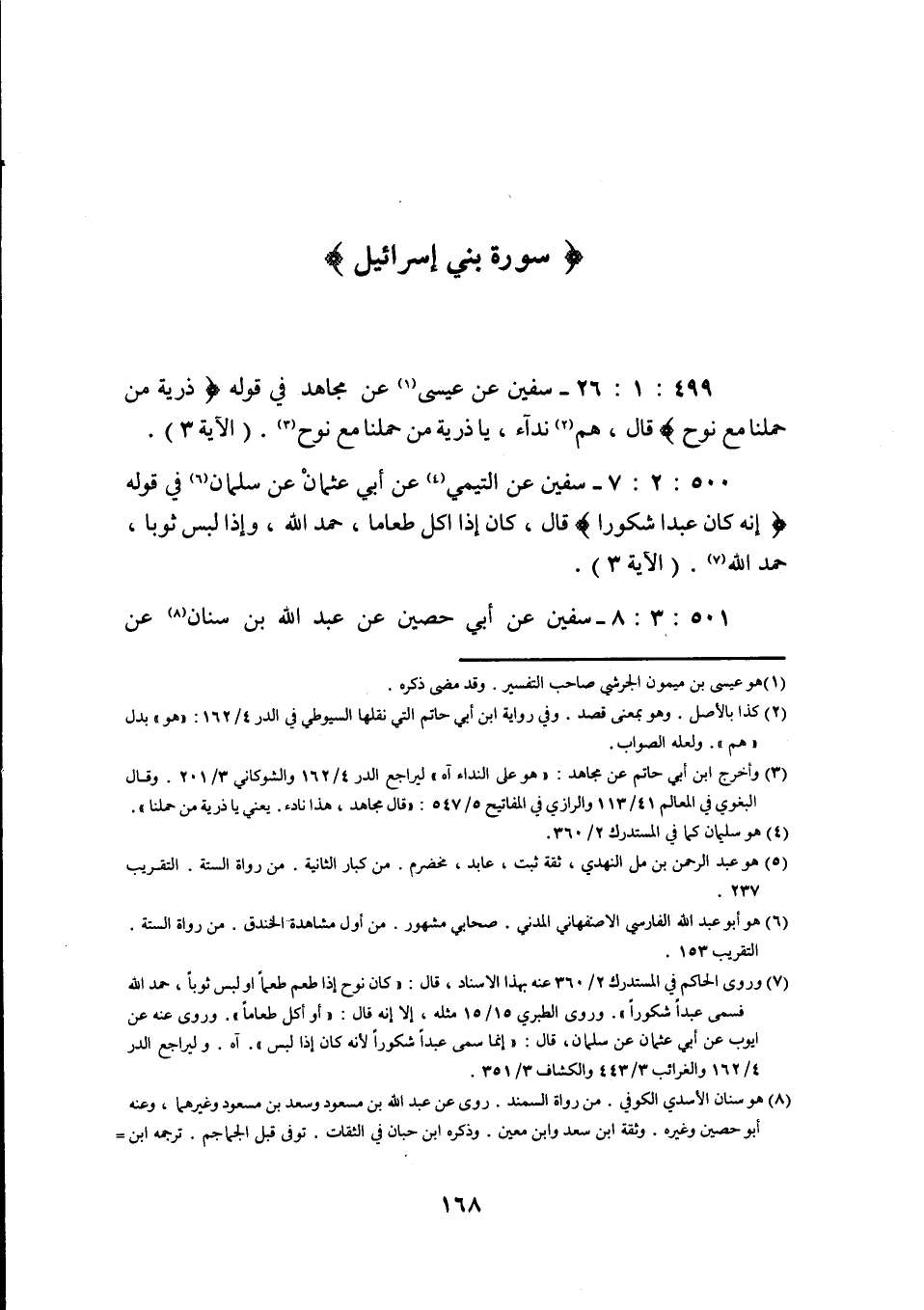 499: 1: 26 سفيان عَنْ عِيسَى عَنْ مُجَاهِدٍ فِي قَوْلِهِ ذُرِّيَّةَ مَنْ حَمَلْنَا مَعَ نوح قَالَ هُمْ نِدَاءٌ يَا ذُرِّيَةَ من حملنا مع نوح (الآية 3) .