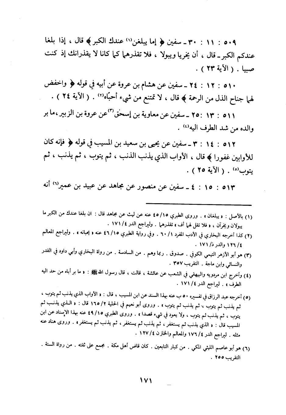 509: 11: 30 سفيان يبلغن عندك الكبر قَالَ إِذَا بَلَغَا عِنْدَكُمُ الْكِبَرَ قَالَ أَنْ يَخْرَيَا وَيَبُولَا فَلَا تَقَذَّرْهُمَا كَمَا كَانَا لَا يَقَذَّرَانِكَ إذ كنت صبيا (الآية 23 (.
