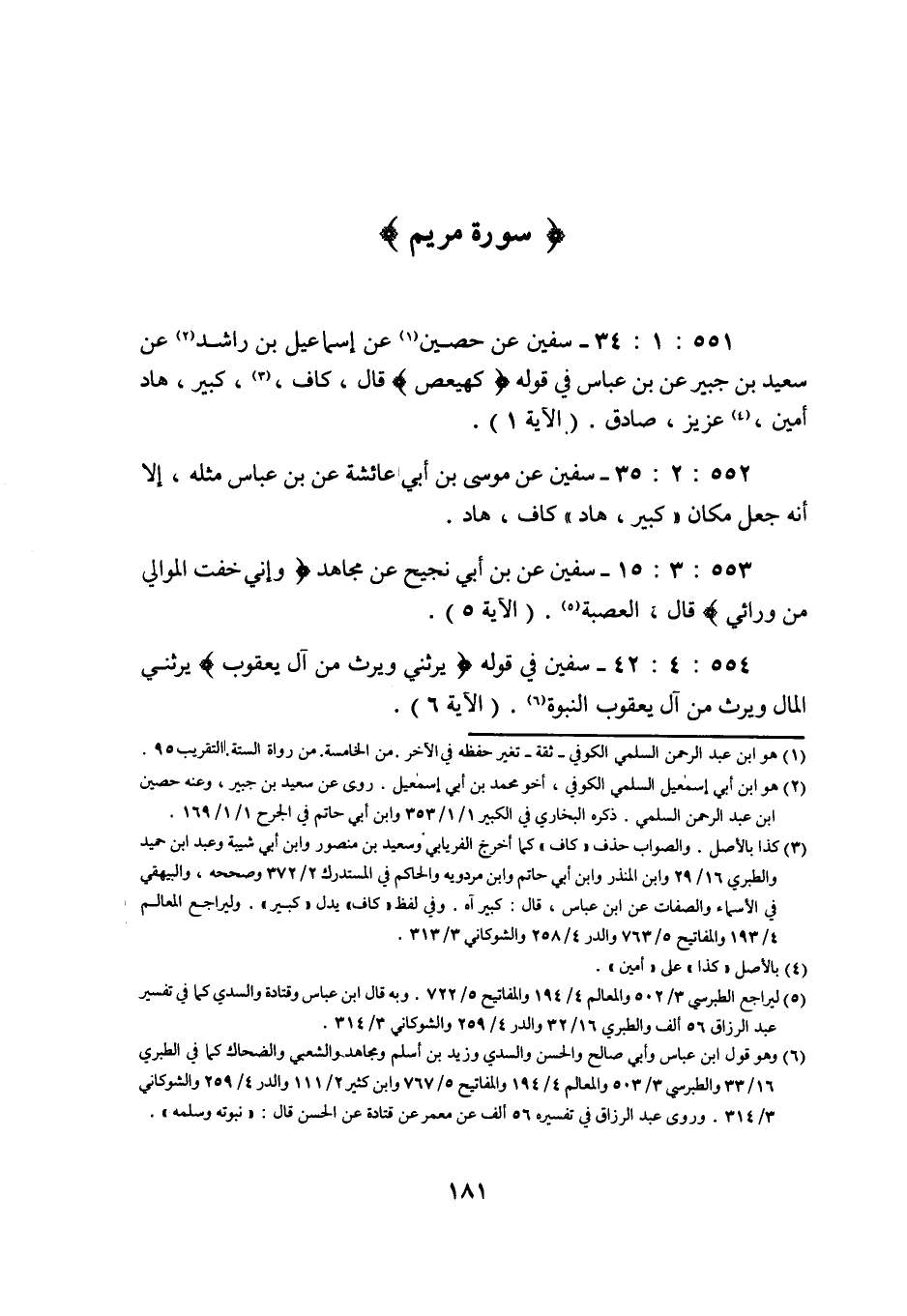 554: 4: 42 سفيان في قوله ويرث من آل يعقوب يَرِثُنِي الْمَالَ وَيَرِثُ مِنْ آلِ يعقوب النبوة (الآية 6) .