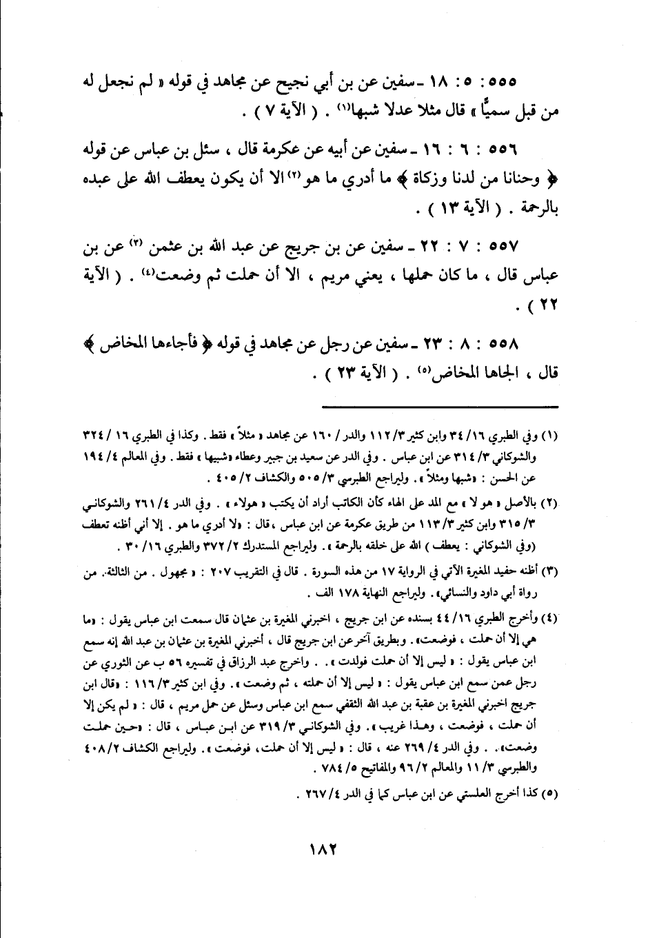 557: 7: 22 سفيان عن بن جُرَيْج عَنْ عَبْدِ اللَّهِ بْنِ عثمن عن بن عَبَّاسٍ قَالَ مَا كَانَ حَمْلُهَا يَعْنِي مَرْيَمَ إِلَّا أَنْ حَمَلَتْ ثم وضعت (الآية 22) .