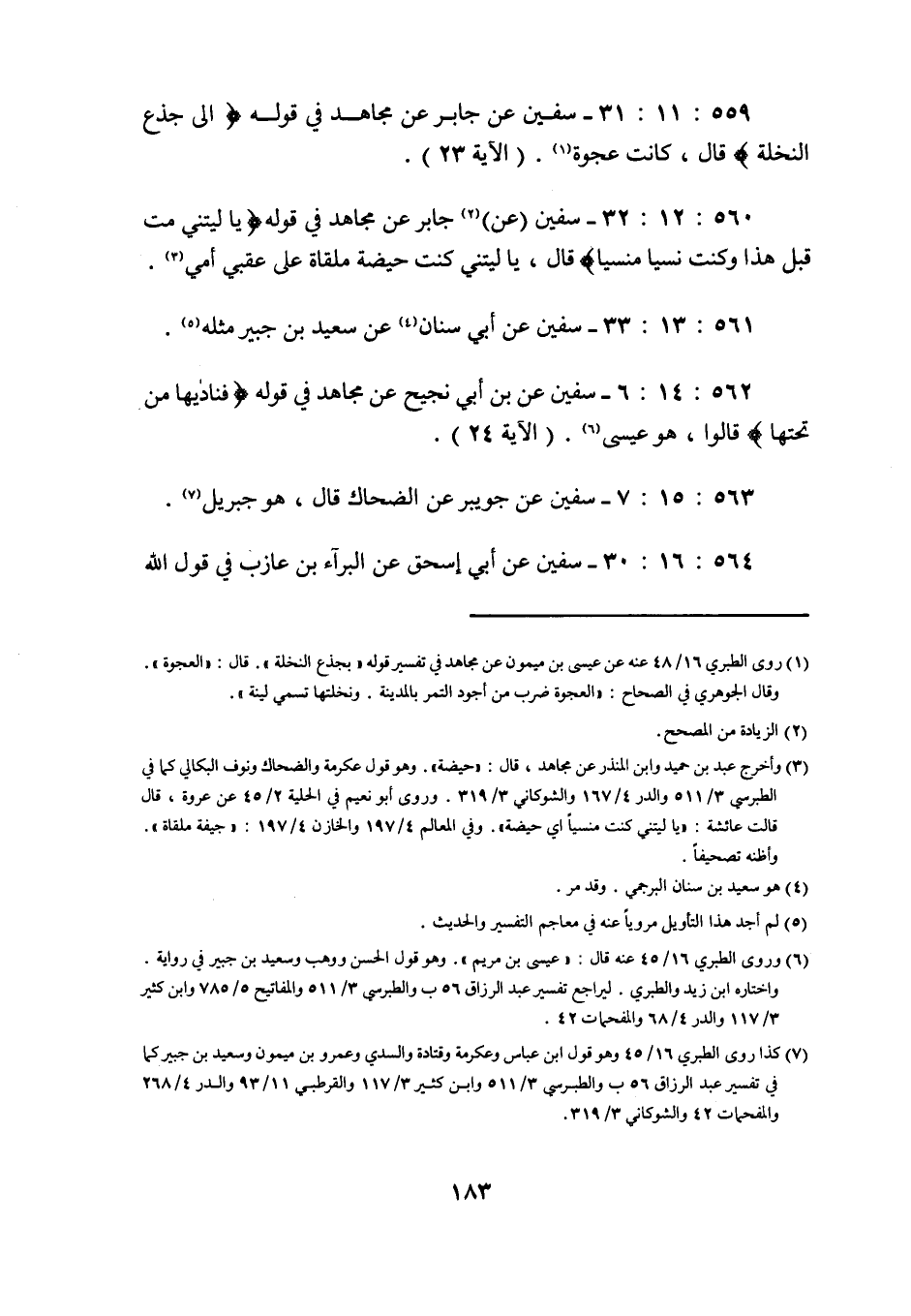 559: د 11: 31 سفيان عَنْ جَابِرٍ عَنْ مُجَاهِدٍ فِي قوله جذع النخلة وهو قال كانت عجوة (الآية 23) .