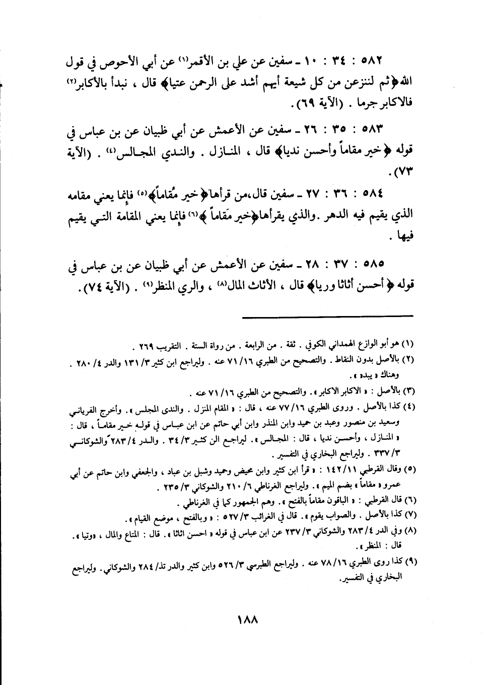 582: 34: 10 سفيان عَنْ عَلِيِّ بْنِ الأَقْمَرِ عَنْ أَبِي الْأَحْوَصِ فِي قَوْلِ اللَّهِ ثُمَّ لَنَنْزِعَنَّ مِنْ كُلِّ شِيعَةٍ أَيُّهُمْ أَشَدُّ عَلَى الرَّحْمَنِ عِتِيًّا قَالَ نَبْدَأُ بِالْأَكَابِرِ فَالْأَكَابِرِ جُرْمًا (الآية 69) .