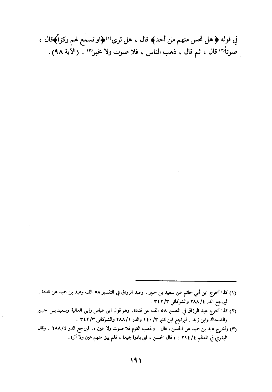 في قوله تحس منهم من أحد قال هل ترى تسمع لهم ركزا قَالَ صَوْتًا قَالَ ثُمَّ قَالَ ذَهَبَ النَّاسُ فَلَا صَوْتَ وَلَا مخبر (الآية 98) .