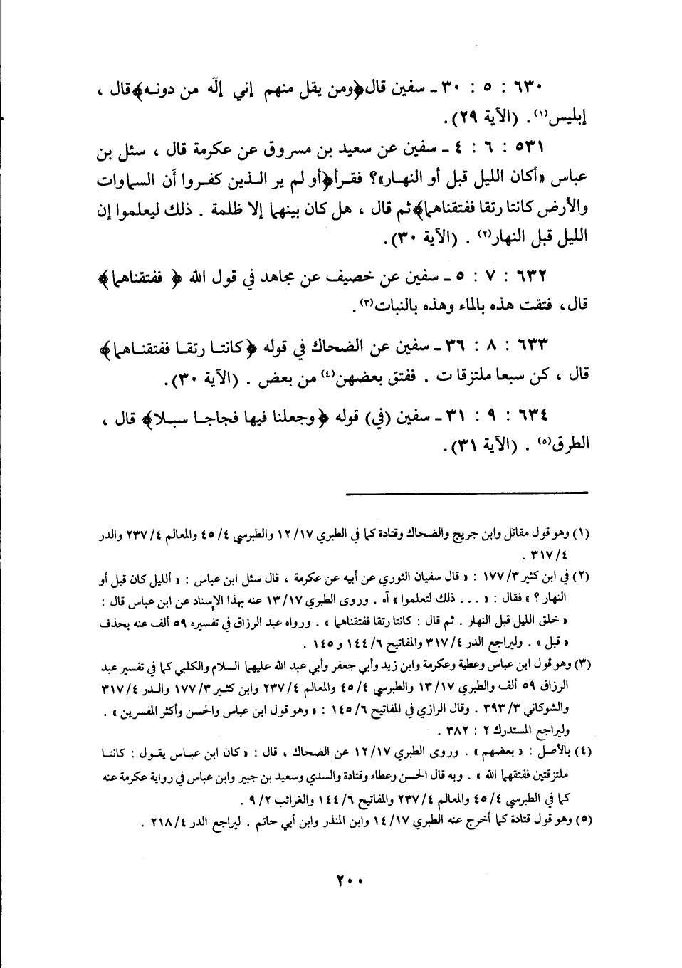 631: 6: 4 سفيان عَنْ سَعِيدِ بْنِ مَسْرُوقٍ عَنْ عكرمة قال سئل بن عَبَّاسٍ أَكَانَ اللَّيْلُ قَبْلُ أَوِ النهار فقرأ ير الذين كفروا أن السماوات والأرض كانتا رتقا ففتقناهما ثُمَّ قَالَ هَلْ كَانَ بَيْنَهُمَا إِلَّا ظُلْمَةٌ ذَلِكَ لِيَعْلَمُوا أَنَّ الليل قبل النهار (الآية 30) .
