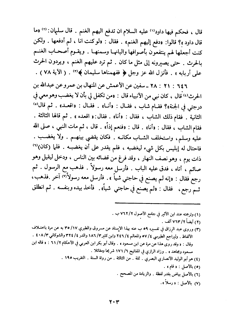 646: 21: 28 سفيان عَنِ الْأَعْمَشِ عَنِ الْمِنْهَالِ بْنِ عَمْرٍو عَنْ عَبْدِ اللَّهِ بْنِ الحرث قَالَ كَانَ نَبِيٌّ مِنَ الْأَنْبِيَاءِ قَالَ مَنْ تَكَفَّلَ لِي بِأَنْ لا يغضب وهو مَعِي فِي دَرَجَتِي فِي الْجَنَّةِ فَقَامَ شَابٌّ فَقَالَ أَنَا فَقَالَ اقْعُدْ ثُمَّ قَالَ الثَّانِيَةَ فَقَامَ ذَلِكَ الشَّابُّ فَقَالَ أَنَا فَقَالَ أَقْعِدْهُ ثُمَّ قَالَهَا الثَّالِثَةَ فَقَامَ الشَّابُّ فَقَالَ أَنَا قَالَ فَنِعْمَ إِذًا قَالَ ثُمَّ مَاتَ النَّبِيُّ صَلَّى اللَّهُ عَلَيْهِ وَسَلَّمَ وَاسْتَخْلَفَ الشَّابَّ مَكَانَهُ فَكَانَ يَقْضِي بَيْنَهُمْ وَلَا يَغْضَبُ فَاحْتَالَ لَهُ إِبْلِيسُ بكل شئ ليغضبه فَلَمْ يَقْدِرْ عَلَى أَنْ يُغْضِبَهُ فَلَمَّا كَانَ ذَاتَ يَوْمٍ وَهُوَ نِصْفُ النَّهَارِ وَقَدْ فَرَغَ مِنْ قَضَائِهِ بَيْنَ النَّاسِ وَدَخَلَ لِيُقَيِّلَ وَهُوَ صَائِمٌ أَتَاهُ فَدَقَّ عَلَيْهِ الْبَابَ فَأَرْسَلَ مَعَهُ رَسُولًا فَذَهَبَ مَعَ الرَّسُولِ ثُمَّ رَجَعَ فَقَالَ إِنَّهُ لَمْ يَصْنَعْ فِي حَاجَتِي شيا فَأَرْسَلَ مَعَهُ رَسُولًا آخَرَ فَذَهَبَ ثُمَّ رَجَعَ فَقَالَ لَمْ يَصْنَعْ في حاجتي شيا فَأَخَذَ بِيَدِهِ وَبِنَفْسِهِ ثُمَّ انْطَلَقَ