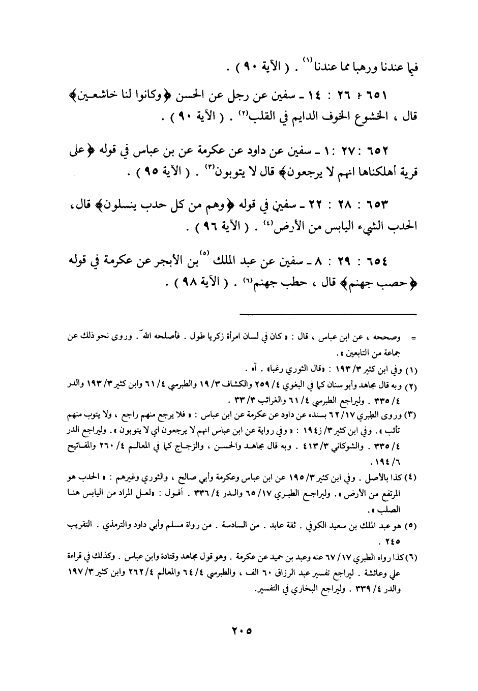 652: 27: 1 سفيان عَنْ دَاوُدَ عَنْ عِكْرِمَةَ عَنِ بن عَبَّاسٍ فِي قَوْلِهِ عَلَى قَرْيَةٍ أهلكناها انهم لا يرجعون قال لا يتوبون (الآية 95) .