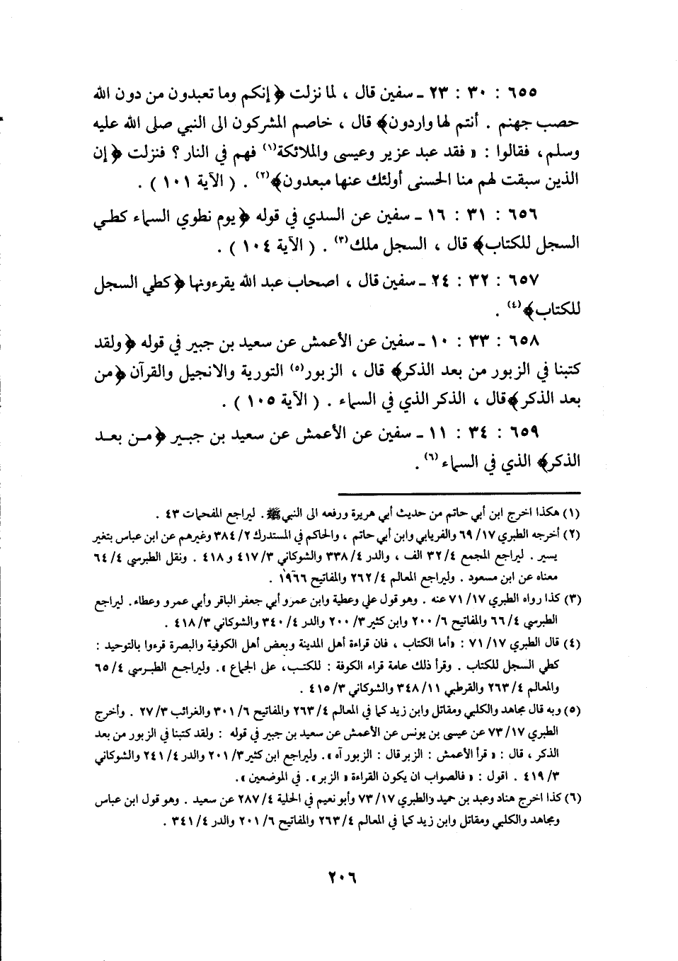 655: 30: 23 سفيان قال لما نزلت مع وَمَا تَعْبُدُونَ مِنْ دُونِ اللَّهِ حصب جهنم أنتم لها واردن قَالَ خَاصَمَ الْمُشْرِكُونَ إِلَى النَّبِيِّ صَلَّى اللَّهُ عَلَيْهِ وَسَلَّمَ فَقَالُوا فقد عبد عزيز وَعِيسَى وَالْمَلَائِكَةُ فَهُمْ فِي النَّارِ فَنَزَلَتْ إِنَّ الَّذِينَ سَبَقَتْ لَهُمْ مِنَّا الْحُسْنَى أُولَئِكَ عَنْهَا مُبْعَدُونَ (الآية 101) .