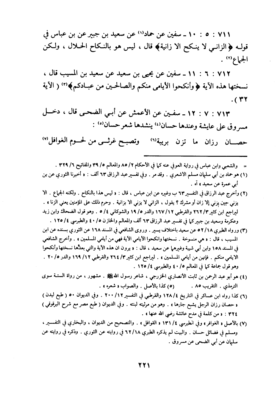 712: 6: 11 سفيان عَنْ يَحْيَى بْنِ سَعِيدٍ عَنْ سَعِيدِ بْنِ الْمُسَيِّبِ قَالَ نَسَخَتْهَا هذه الآية الأَيَامَى مِنْكُمْ وَالصَّالِحِينَ مِنْ عِبَادِكُمْ ولم (الآية 32) .