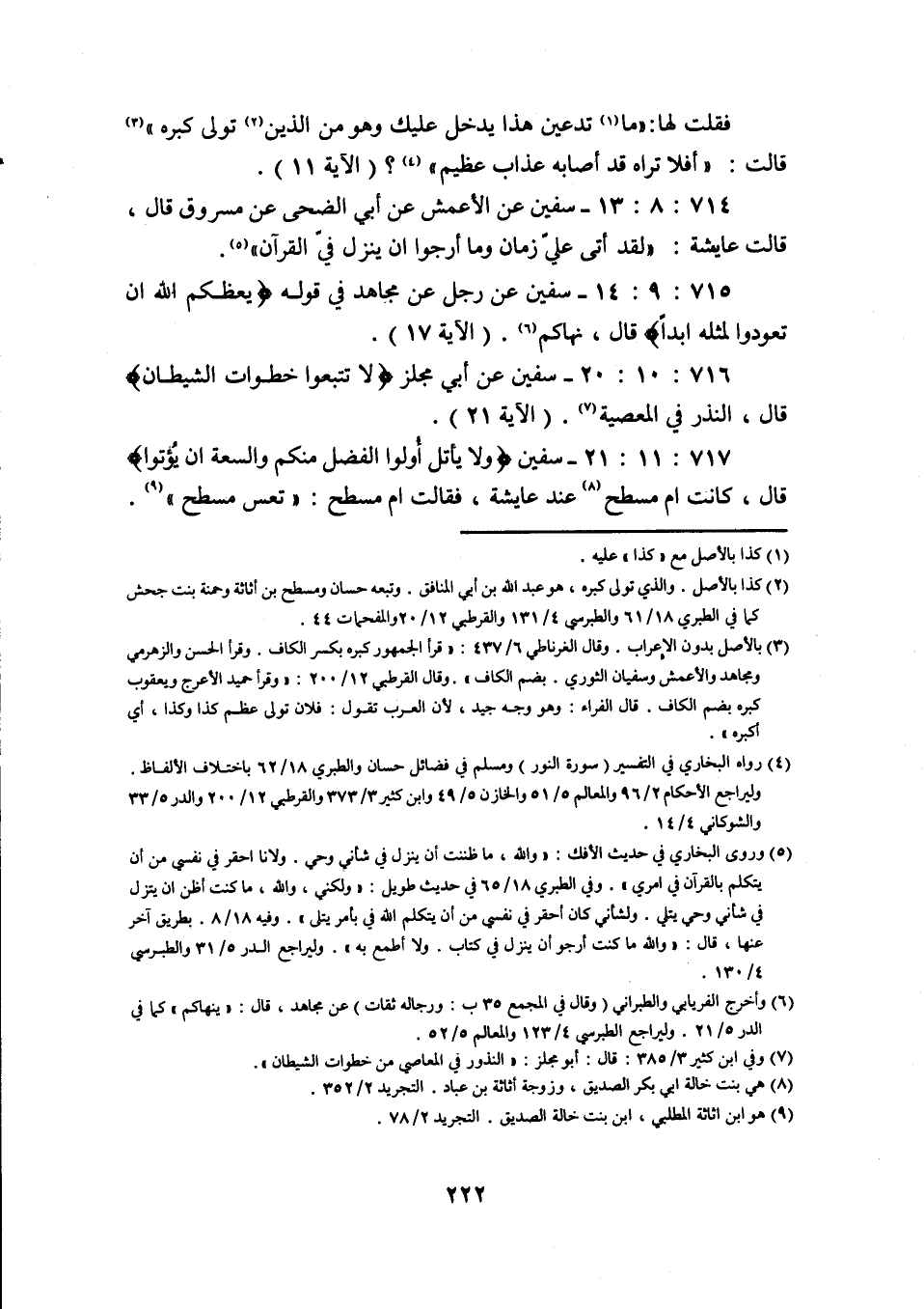 717: 11: 21 سفيان ولا يأتل أولوا الْفَضْلِ مِنْكُمْ وَالسَّعَةِ أَنْ يُؤْتُوا قَالَ كَانَتْ أُمُّ مِسْطَحٍ عِنْدَ عايشة فَقَالَتْ أُمُّ مِسْطَحٍ تَعِسَ مِسْطَحٌ