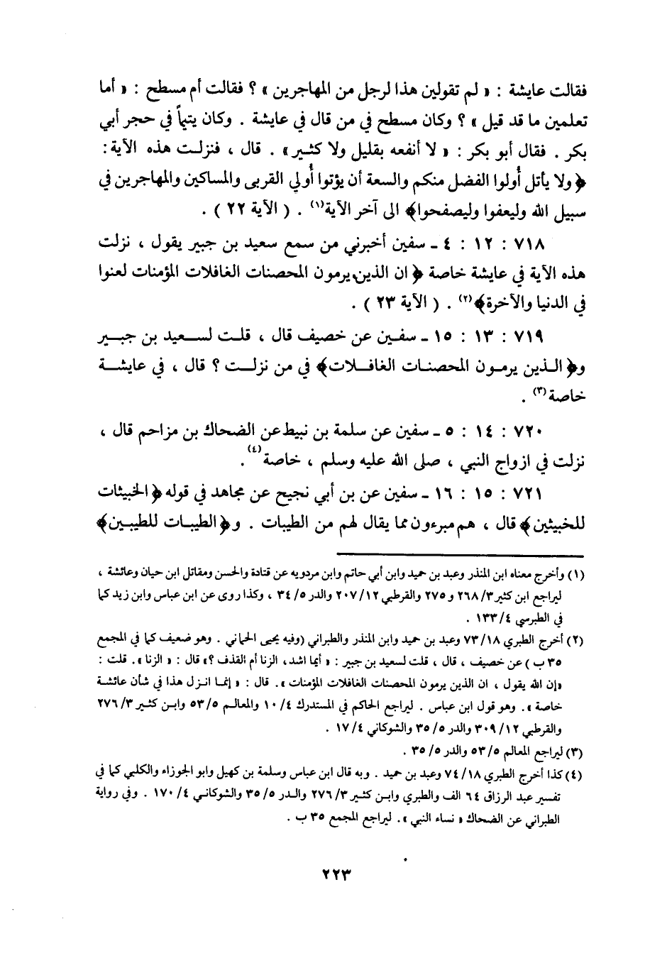 718: 12: 4 سفيان أَخْبَرَنِي مَنْ سَمِعَ سَعِيدَ بْنَ جُبَيْرٍ يَقُولُ نَزَلَتْ هَذِهِ الْآيَةُ في عايشة خَاصَّةً إِنَّ الَّذِينَ يَرْمُونَ الْمُحْصَنَاتِ الْغَافِلاتِ الْمُؤْمِنَاتِ لُعِنُوا فِي الدُّنْيَا والآخرة (الآية 23) .