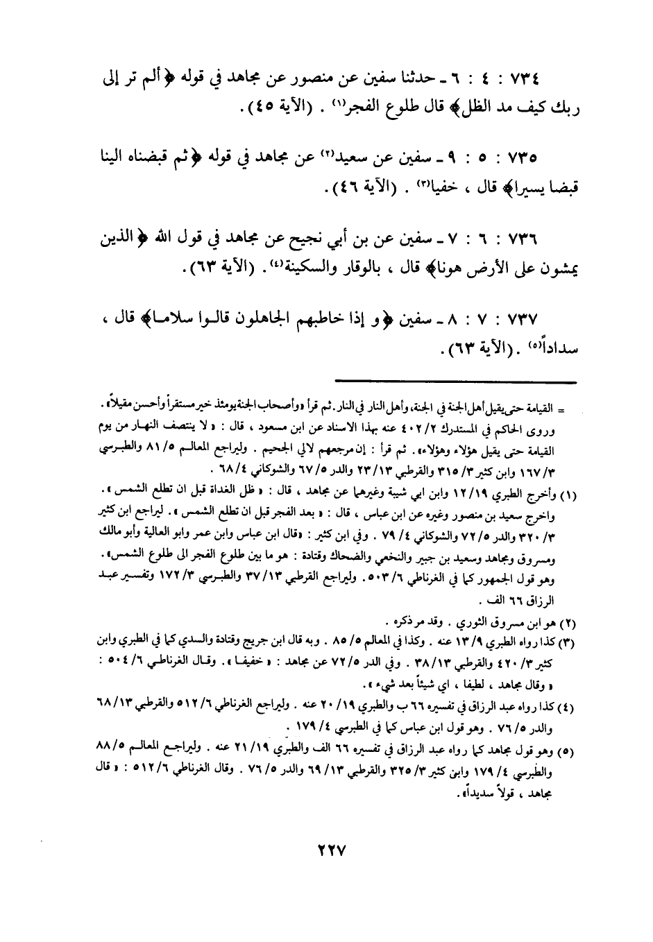734: 4: 6 حدثنا سفيان عَنْ مَنْصُورٍ عَنْ مُجَاهِدٍ فِي قوله تَرَ إِلَى رَبِّكَ كَيْفَ مَدَّ الظل قال طلوع الفجر (الآية 45) .