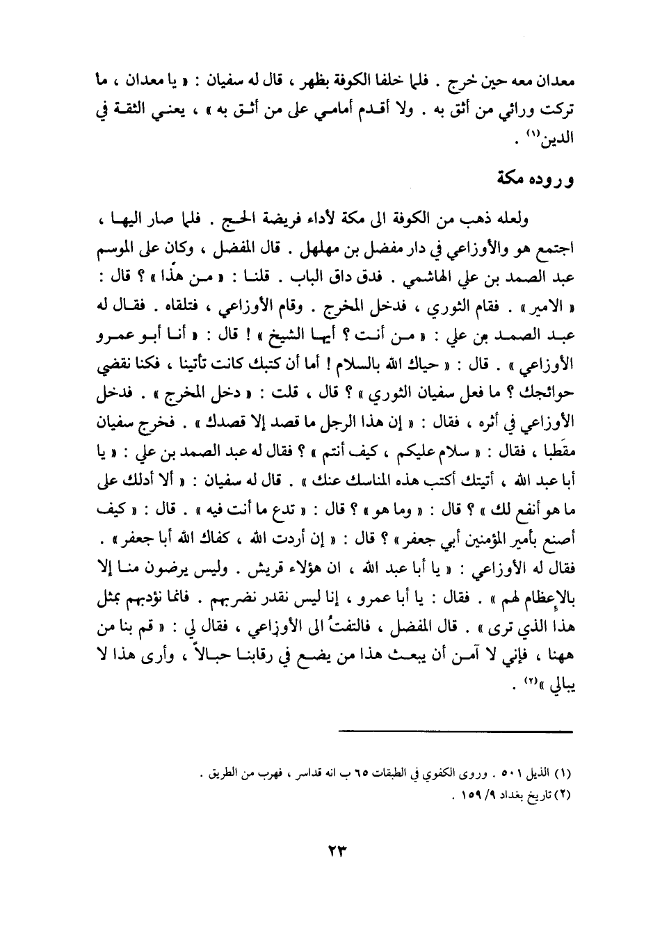 وقام الاوزاعي، فتلقاه فقال له عبد الصمد بن على: (من أنت؟ أيها الشيخ) ! قال: (أنا أبو عمرو الاوزاعي) قال: (حياك الله بالسلام! أما أن كتبك كانت تأتينا فكنا نقضى حوائجك؟ ما فعل سفيان الثوري) ؟ قال قلت (دخل المخرج) فدخل الاوزاعي في أثره فقال (سلام عليكم، كيف أنتم) ؟ فقال له عبد الصمد بن على (يا أبا عبد الله أتيتك أكتب هذه المناسك عنكك) قال له سفيان (ألا أدلك على ما هو أنفع لك) ؟ قال (وما هو) ؟ قال (تدع ما أنت فيه) قال (كيف أصنع بأمير المؤمنين أبى جعفر) ؟ قال (إن أردت الله كفاك الله أبا جعفر) فقال له الاوزاعي (يا أبا عبد الله، ان هؤلاء قريش. وليس يرضون منا إلا بالاعظام لهم) فقال: يا أبا عمرو، إنا ليس نقدر نضربهم.