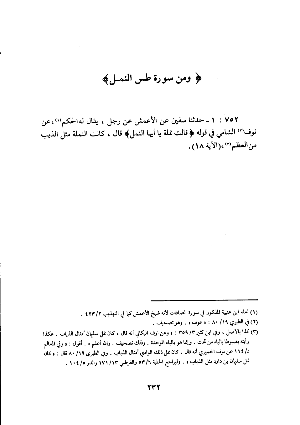 752: 1 حدثنا سفيان عَنِ الْأَعْمَشِ عَنْ رَجُلٍ يُقَالُ لَهُ الْحَكَمُ عَنْ نَوْفٍ الشَّامِّيِّ في قوله نملة يا أيها النمل قَالَ كَانَتِ النَّمْلَةُ مِثْلَ الذيب من العظم (الآية 18) .