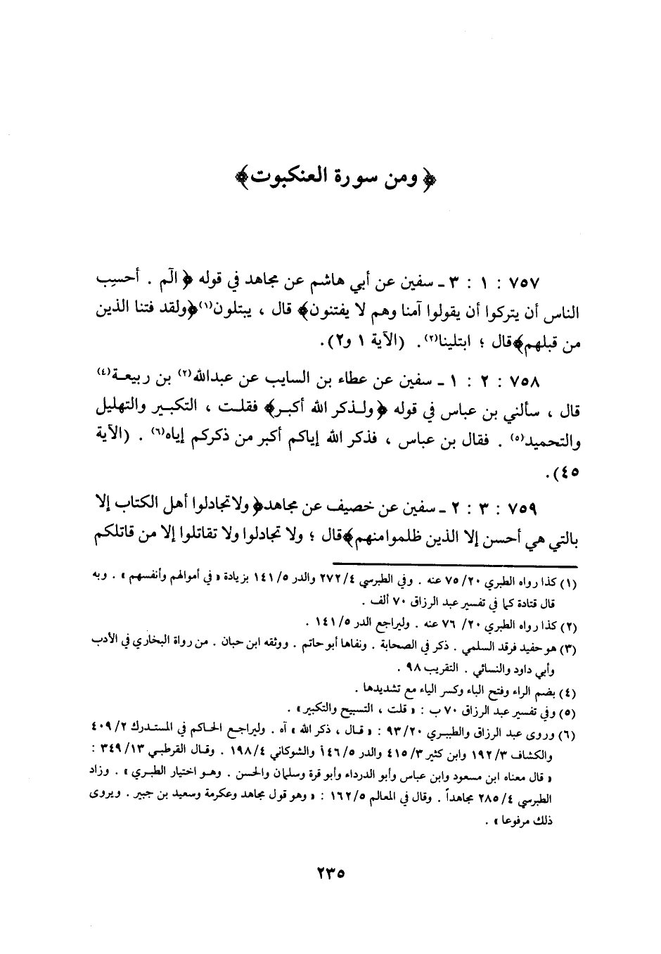 757: 1: 3 سفيان عَنْ أَبِي هَاشِمٍ عَنْ مُجَاهِدٍ فِي قَوْلِهِ الم أَحَسِبَ النَّاسُ أَنْ يُتْرَكُوا أَنْ يَقُولُوا آمَنَّا وهم لا يفتنون قال يبتلون فتنا الذين من قبلهم قال ابتلينا (الآية 1 و 2) .