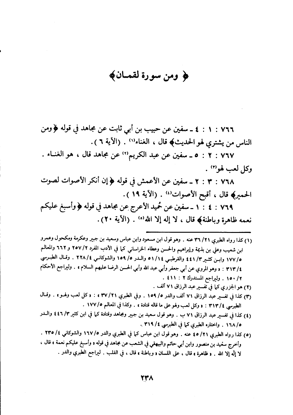 766: 1: 4 سفيان عَنْ حَبِيبِ بْنِ أَبِي ثَابِتٍ عَنْ مُجَاهِدٍ فِي قَوْلِهِ وَمِنَ النَّاسِ مَنْ يَشْتَرِي لَهْوَ الْحَدِيثِ قال الغناء (الآية 6) .