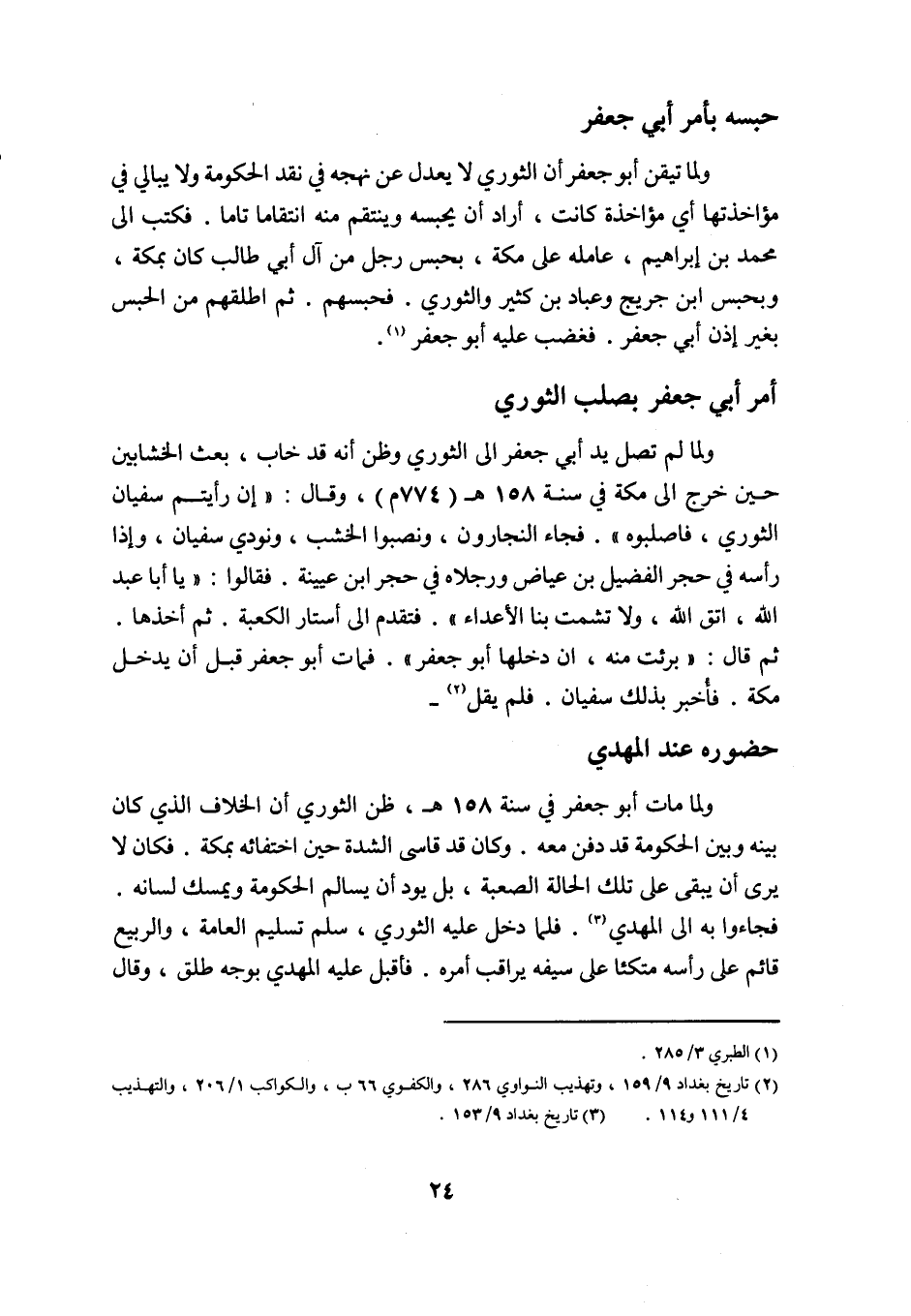فلم يقل - حضوره عند المهدى ولما مات أبو جعفر في سنة 158 هـ، ظن الثوري أن الخلاف الذى كان بينه وبين الحكومة قد دفن معه.