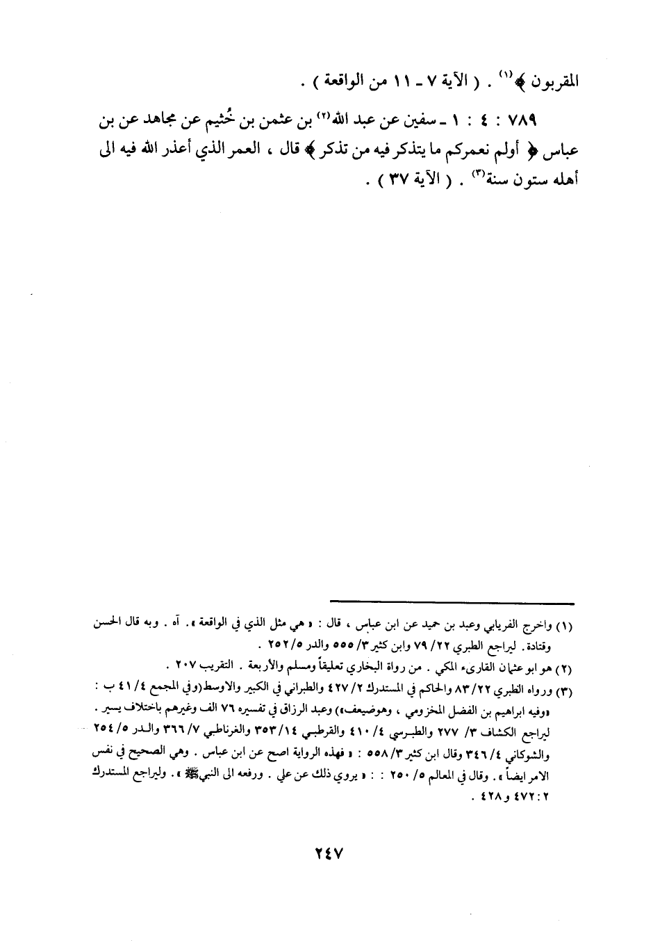 789: 4: 1 سُفْيَانُ عَنْ عَبْدِ اللَّهِ بْنِ عثمن بْنِ خُثَيْمٍ عَنْ مُجَاهِدٍ عَنِ بن عَبَّاسٍ أَوَلَمْ نُعَمِّرْكُمْ مَا يَتَذَكَّرُ فيه من تذكر لو قَالَ الْعُمْرُ الَّذِي أَعْذَرَ اللَّهُ فِيهِ إِلَى أَهْلِهِ سِتُّونَ سَنَةً (الآية 37) .