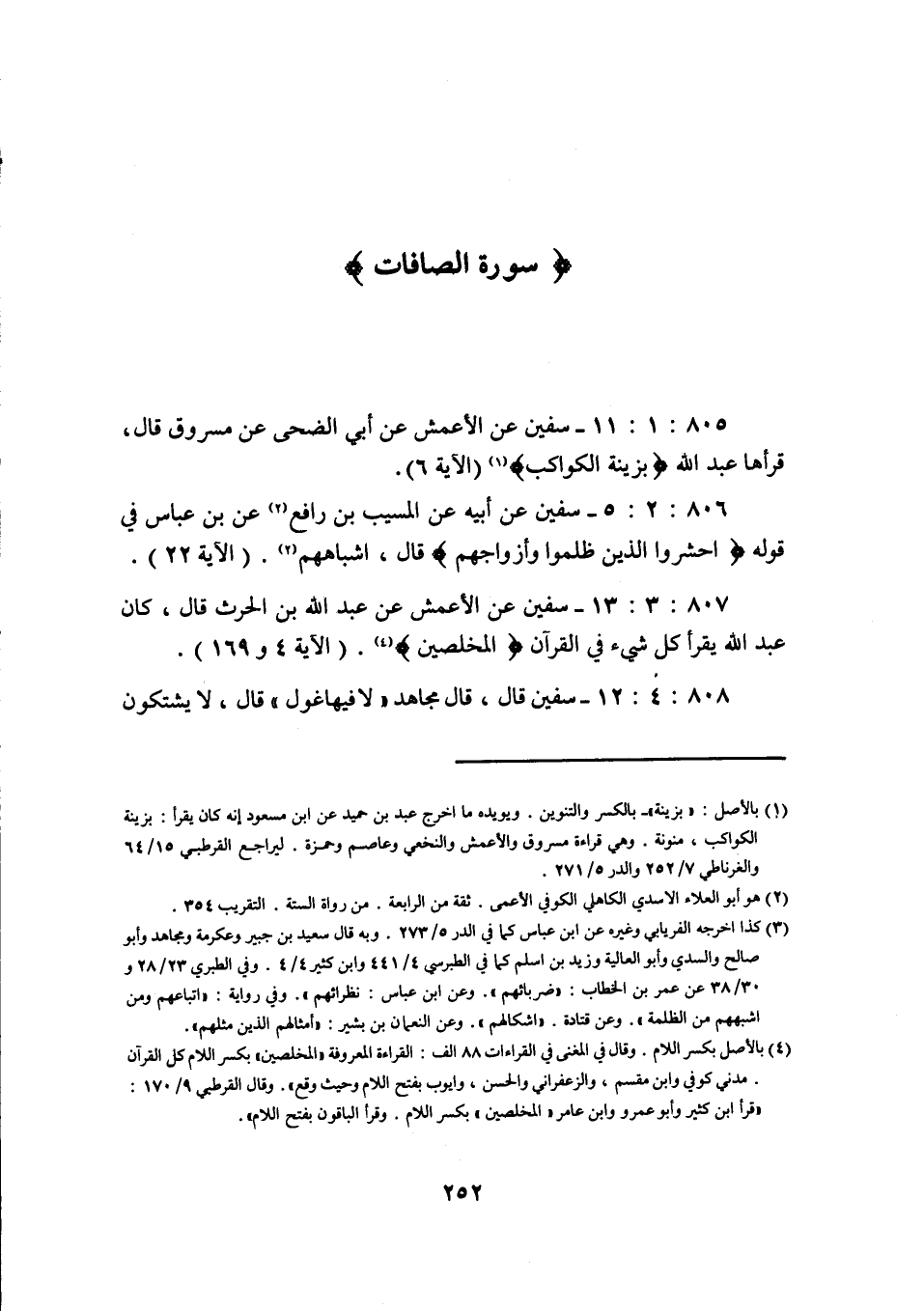 807: 3: 13 سفيان عَنِ الْأَعْمَشِ عَنْ عَبْدِ اللَّهِ بن الحرث قَالَ كَانَ عَبْدُ اللَّهِ يَقْرَأُ كل شئ في القرآن (الآية 4 و 169) .