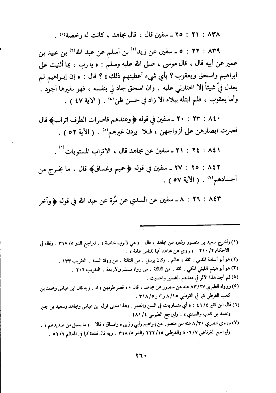 842: 25: 27 سفيان في قوله حميم وغساق قَالَ مَا يَخْرُجُ مِنْ أَجْسَادِهِمْ (الآية 57) .