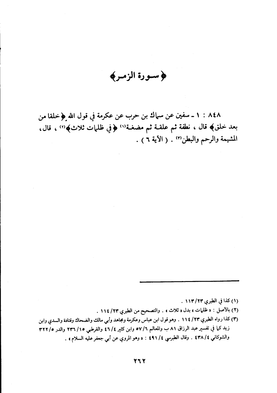 848: 1 سفيان عَنْ سِمَاكِ بْنِ حَرْبٍ عَنْ عِكْرِمَةَ فِي قَوْلِ اللَّهِ خَلْقًا من بعد خلق قَالَ نُطْفَةٌ ثُمَّ عَلَقَةٌ ثُمَّ مضغة في ظلمات ثلاث قال المشيمة والرحم والبطن (الآية 6) .