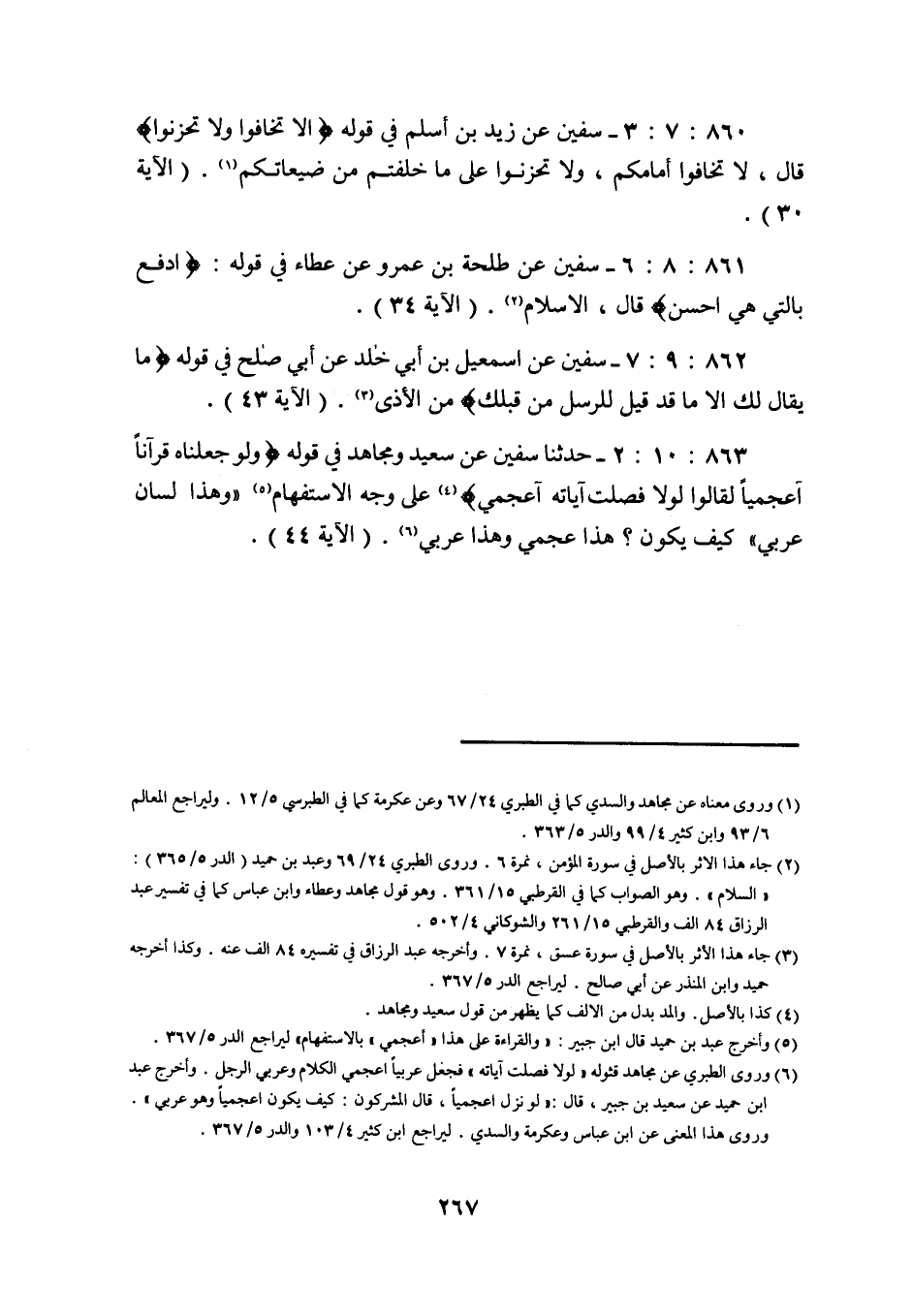 860: 7: 3 سفيان عَنْ زَيْدِ بْنِ أَسْلَمَ فِي قَوْلِهِ أَلَّا تَخَافُوا وَلا تَحْزَنُوا قَالَ لَا تَخَافُوا أَمَامَكُمْ وَلَا تَحْزَنُوا عَلَى مَا خَلْفَكُمْ مِنْ ضيعاتكم (الآية 30) .