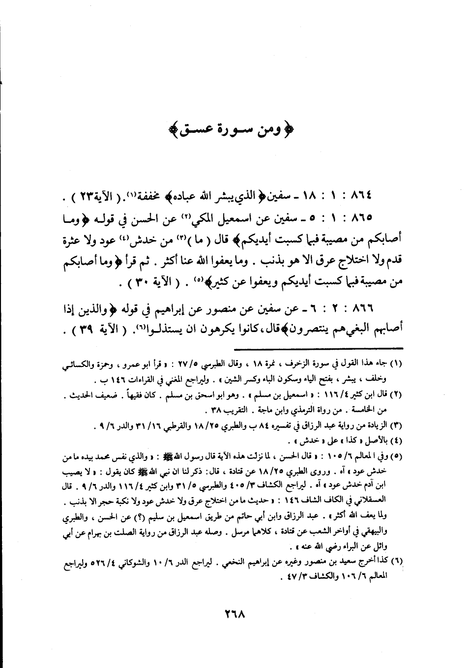 865: 1: 5 سفيان عن اسمعيل الْمَكِّيِّ عَنِ الْحَسَنِ فِي قَوْلِهِ وَمَا أَصَابَكُمْ مِنْ مُصِيبَةٍ فَبِمَا كسبت أيديكم قَالَ مَا مِنْ خَدْشِ عُودٍ وَلَا عَثْرَةِ قَدَمٍ وَلَا اخْتِلَاجِ عِرْقٍ إِلَّا هُوَ بِذَنْبٍ وَمَا يعفوا اللَّهُ عَنَّا أَكْثَرُ ثُمَّ قَرَأَ وَمَا أَصَابَكُمْ مِنْ مُصِيبَةٍ فَبِمَا كسبت أيديكم ويعفوا عن كثير (الآية 30) .