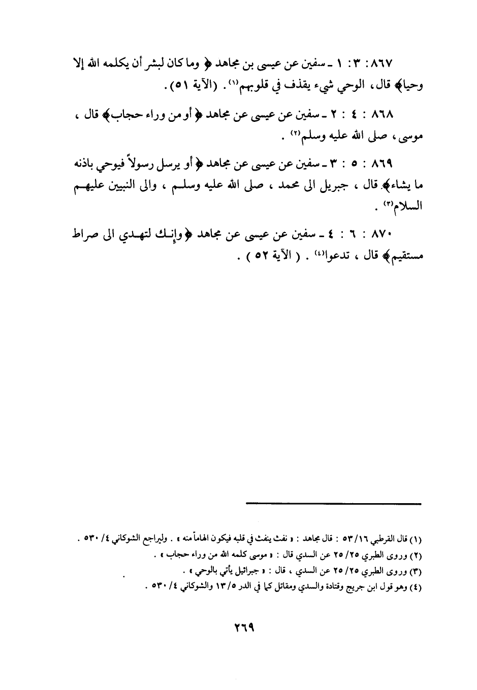 867: 3: 1 سفيان عن عيسى بن مُجَاهِدٍ وَمَا كَانَ لِبَشَرٍ أَنْ يُكَلِّمَهُ اللَّهُ إِلَّا وَحْيًا قَالَ الوحي شئ يقذف في قلوبهم (الآية 51) .