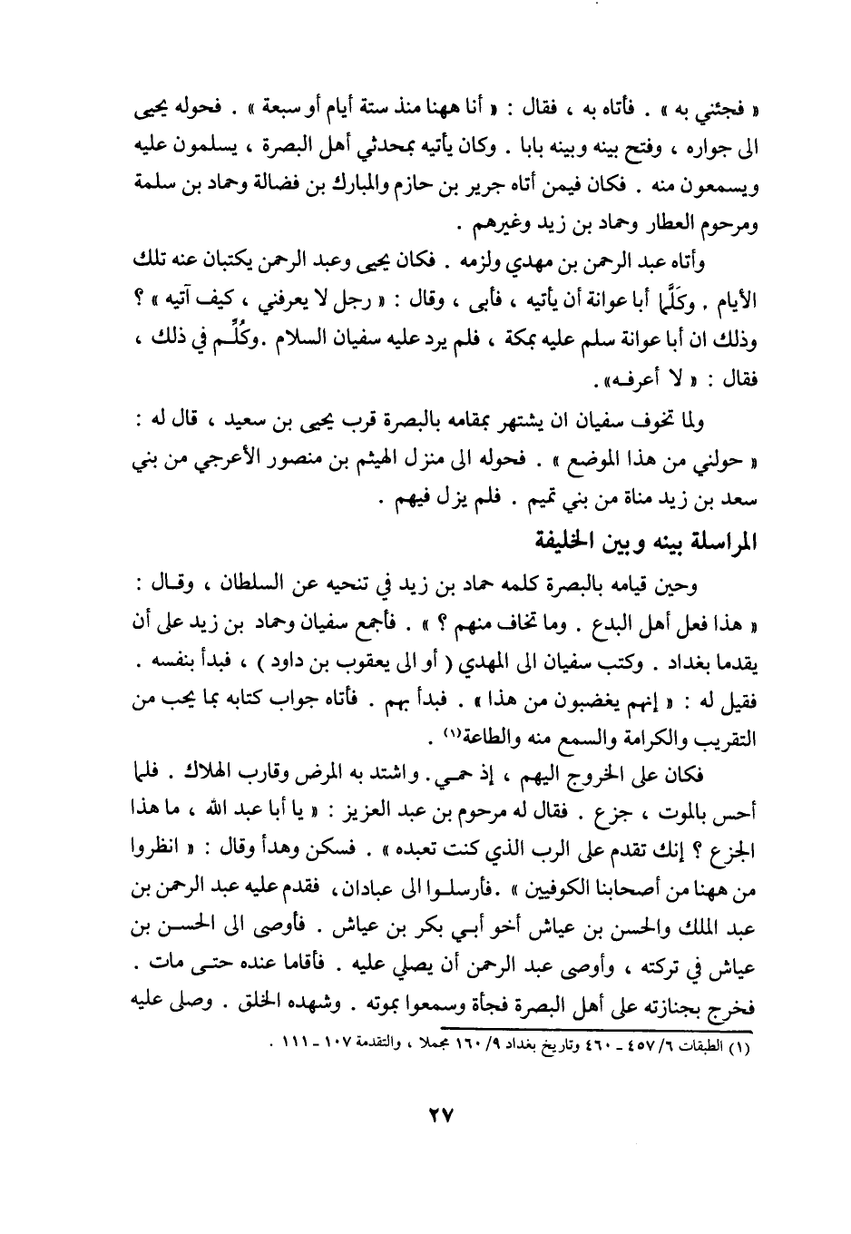 فلم يزل فيهم المراسلة بينه وبين الخليفة وحين قيامة بالبصرة كلمه حماد بن زيد في تنحيه عن السلطان وقال (هذا فعل أهل البدع.