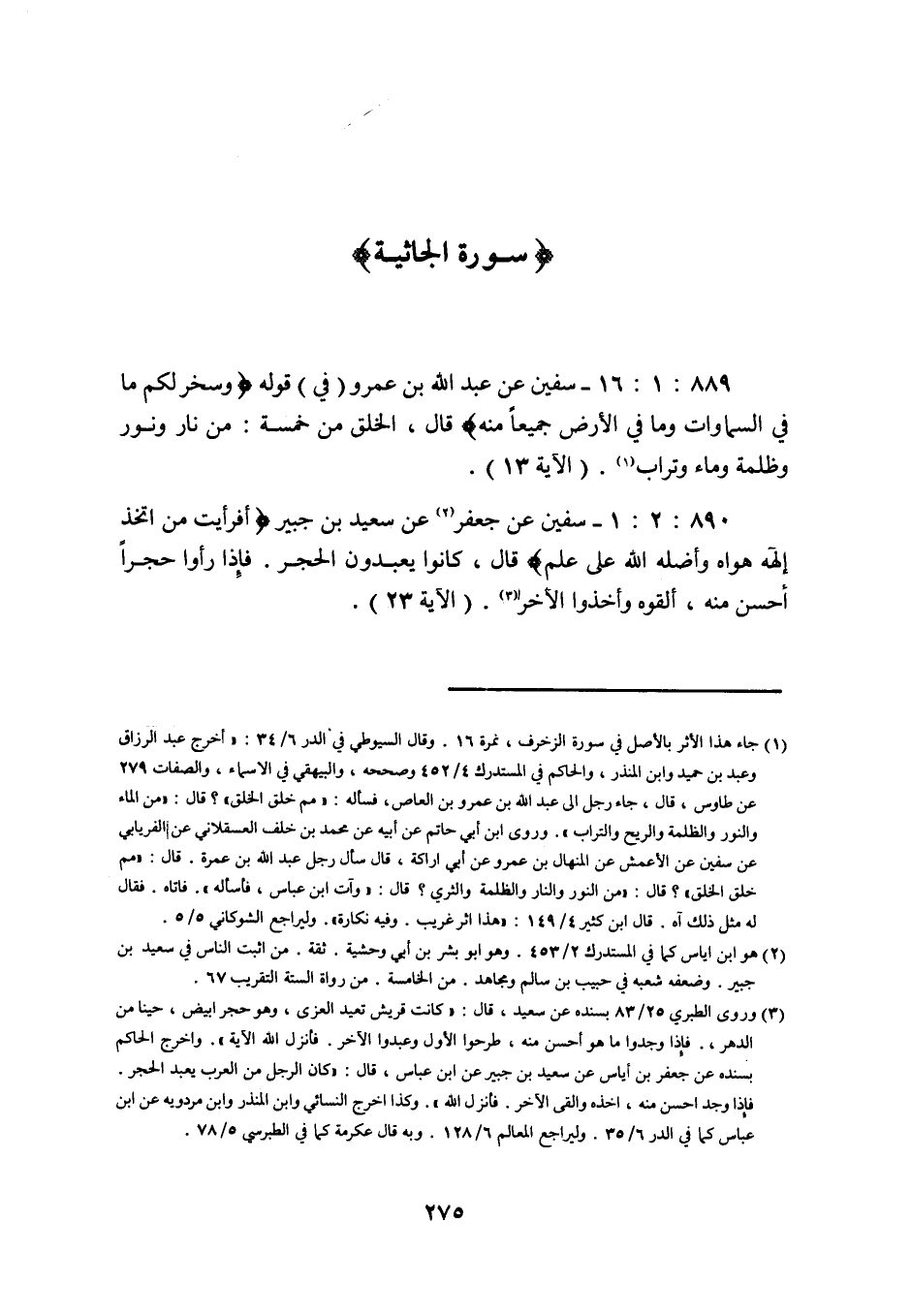 890: 2: 1 سفيان عَنْ جَعْفَرٍ عَنْ سَعِيدِ بْنِ جُبَيْرٍ أَفَرَأَيْتَ مَنِ اتَّخَذَ إِلَهَهُ هَوَاهُ وَأَضَلَّهُ اللَّهُ عَلَى عِلْمٍ قَالَ كَانُوا يَعْبُدُونَ الْحَجَرَ فَإِذَا رَأَوْا حَجَرًا أَحْسَنَ مِنْهُ أَلْقَوْهُ وأخذوا الآخر (الآية 23) .