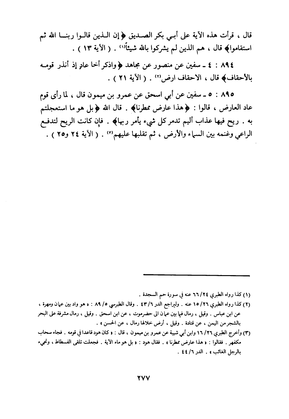 895: 5 سفيان عن أبي اسحق عَنْ عَمْرِو بْنِ مَيْمُونٍ قَالَ لَمَّا رَأَى قَوْمُ عَادٍ الْعَارِضَ قالوا هذا عارض ممطرنا قَالَ اللَّهُ بَلْ هُوَ مَا اسْتَعْجَلْتُمْ بِهِ رِيحٌ فِيهَا عَذَابٌ أليم تدمر كل شئ يأمر ربها فَإِنْ كَانَتِ الرِّيحُ لَتَدْفَعُ الرَّاعِي وَغَنَمَهُ بَيْنَ السَّمَاءِ وَالْأَرْضِ ثُمَّ تقلبها عليهم (الآية 24 و 25) .