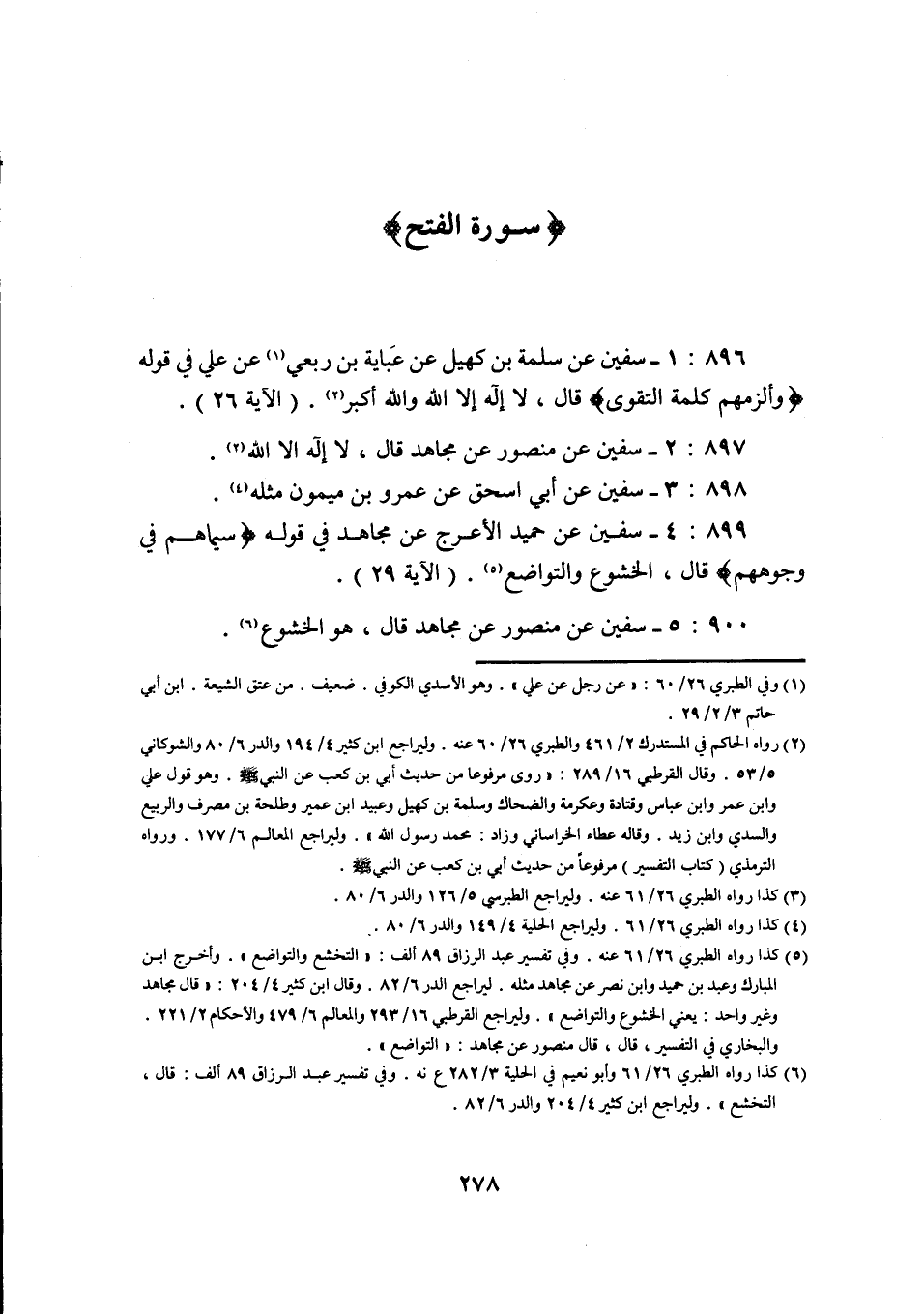 899: 4 سفيان عَنْ حُمَيْدٍ الْأَعْرَجِ عَنْ مُجَاهِدٍ فِي قَوْلِهِ سِيمَاهُمْ فِي وُجُوهِهِمْ قال الخشوع والتواضع (الآية 29) .