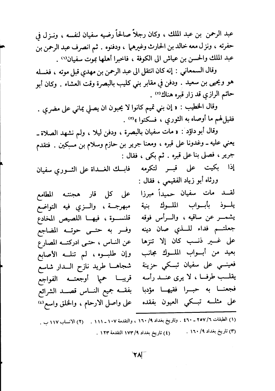 فقال لقد مات سفيان حميدا مبرزا * على كل قار هجنته المطامع يلوذ بأبواب الملوك بنية * مبهرجة والزى فيه التواضع يشمر عن ساقيه والرأس فوقه * قلنسوة فيها اللصيص المخادع جعلتم فداء للذى صان دينه * وفر به حتى حوته المضاجع على غير ذنب كا إلا تنزها * عن الناس حتى ادركته المصارع بعيد من أبواب الملوك مجانب * وإن طلبوه لم تنله الاصابع فعينى على سفيان تبكى حزينة * شجاها طريد نازح الدار شاسع