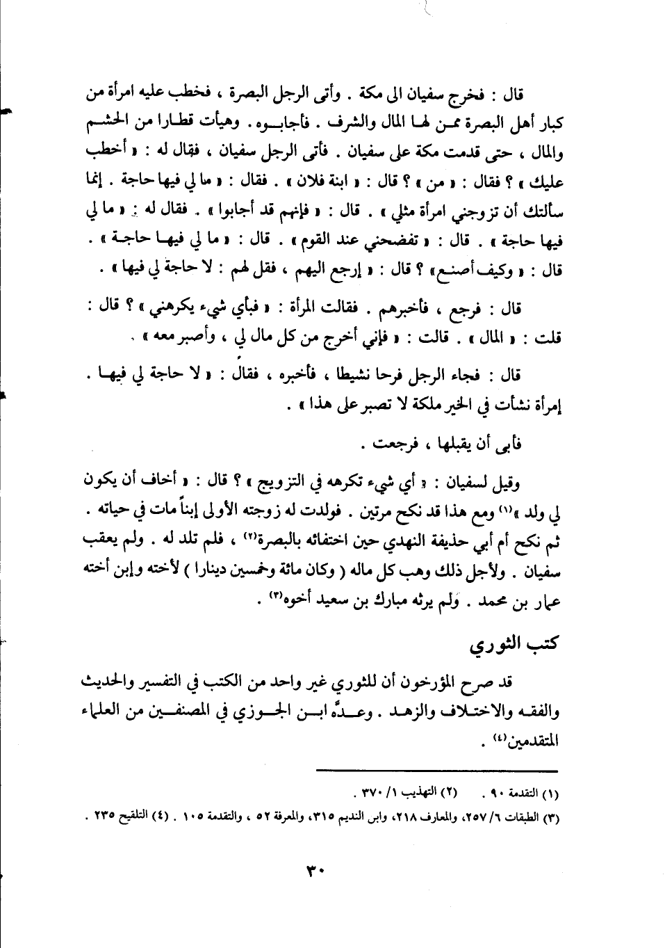 قال (فإنهم قد أجابوا) فقال له (ما لى فيها حاجه) قال (تفضحني عند القوم) قال (ما لى فيها حاجه) قال (وكيف أصنع) ؟ قال (إرجع الى القوم فقل لهم لا حاجة لى فيها) قال: فرجع فأخبرهم فقالت الورأة فبأى شئ يكرهنى) ؟ قال: قلت (المال) قالت (فإنى أخرج من كل مال لى، وأصبر معه) قال: فجاء الجل نشطا فأخبره فقال (لا حاجة لى فيها إمرأة نشأت في الخير ملكة لا تصبر على هذا فأبى أن يقبلها فرجعت وقبيل لسفيان (أي شئ تكرهه في التزويج) ؟ قال (أخاف أن يكون لى ولد) ومع هذا قد نكح مرتين.