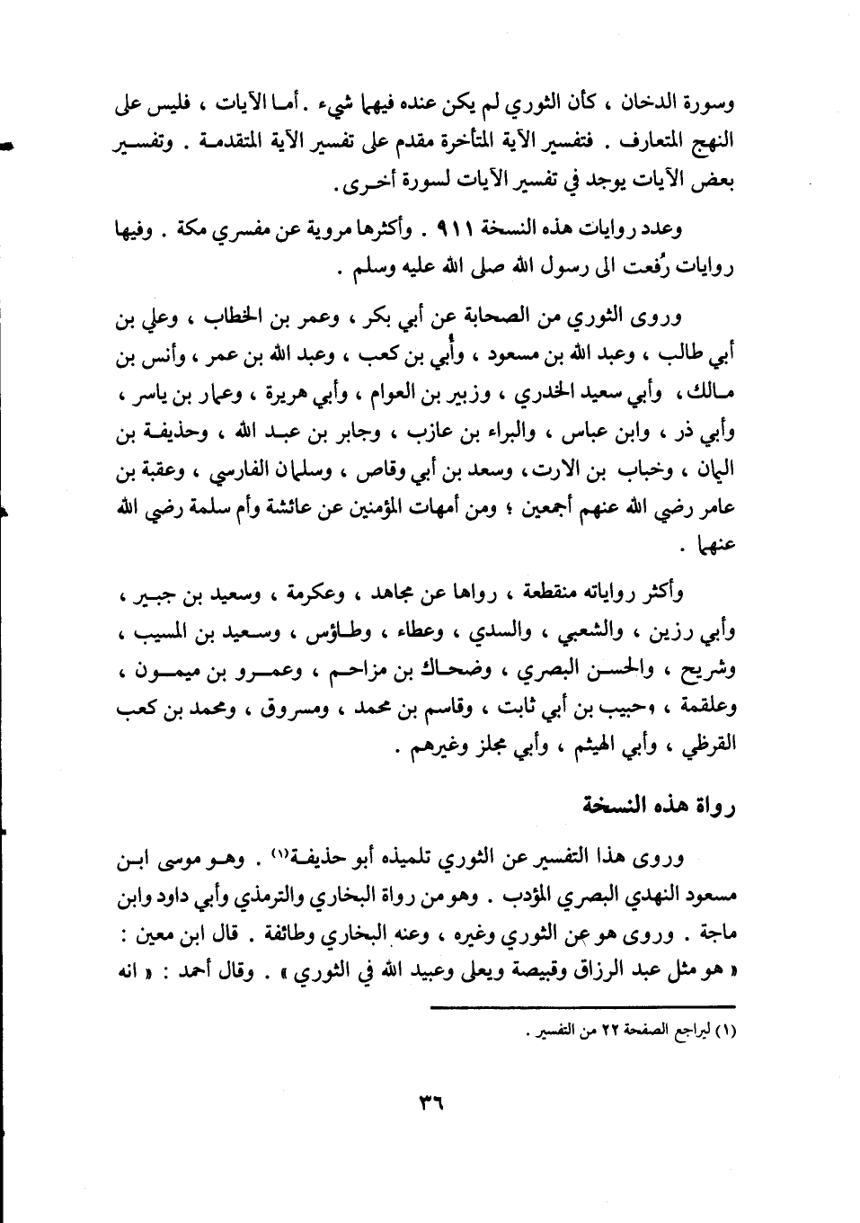 وفيها روايات رفعت الى رَسُولِ اللَّهِ صَلَّى اللَّهُ عَلَيْهِ وسلم وروى الثوري من الصحابة عن أبى بكر وعمر بن الخطاب وعلى بن أبى طالب وعبد الله بن مسعود وأبى بن كعب وعبد الله بن عمر وأنس بن مالك وأبى سعيد الخدرى وزبير بن العوام وأبى هريرة وعمار بن ياسر وإبى ذر وابن عباس والبراء بن عازب وجابر بن عبد الله وحذيفة بن اليمان وخباب بن الارت وسعد بن أبى وقاص وسلمان الفارسى وعقبة بن عامر رضى الله عنهم أجمعين ومن أمهات المؤمنين عن عائشة وأم سلمة رضى الله عنهما