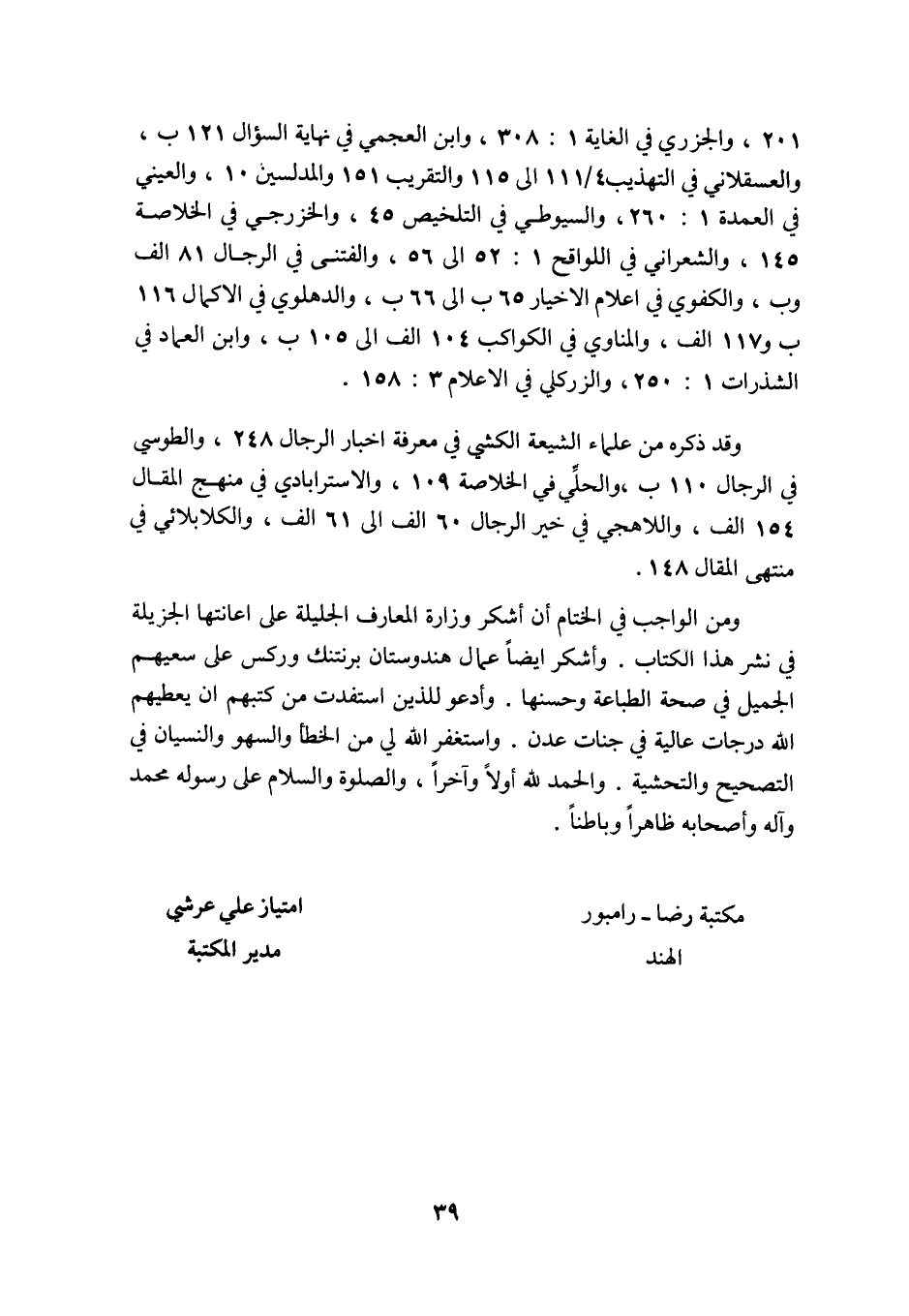 من الواجب في الختام ان اشكر وزارة المعارف الجليلة على اعانتها الجزيلة في نشر هذا الكتاب واشكر ايضا عمال هندوستان برنتنك وركس على سعيهم الجميل في صحة الطباعة وحسنها.
