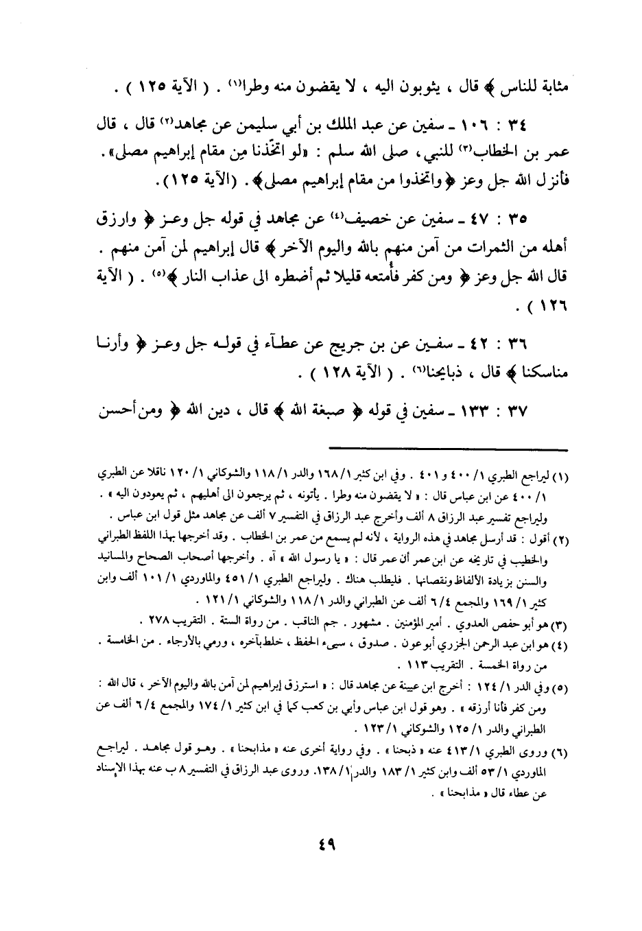 36: 42 سفيان عن بن جُرَيْجٍ عَنْ عَطَاءٍ فِي قَوْلِهِ جل وعز وأرنا مناسكنا قال ذبايحنا يقول (الآية 128) .